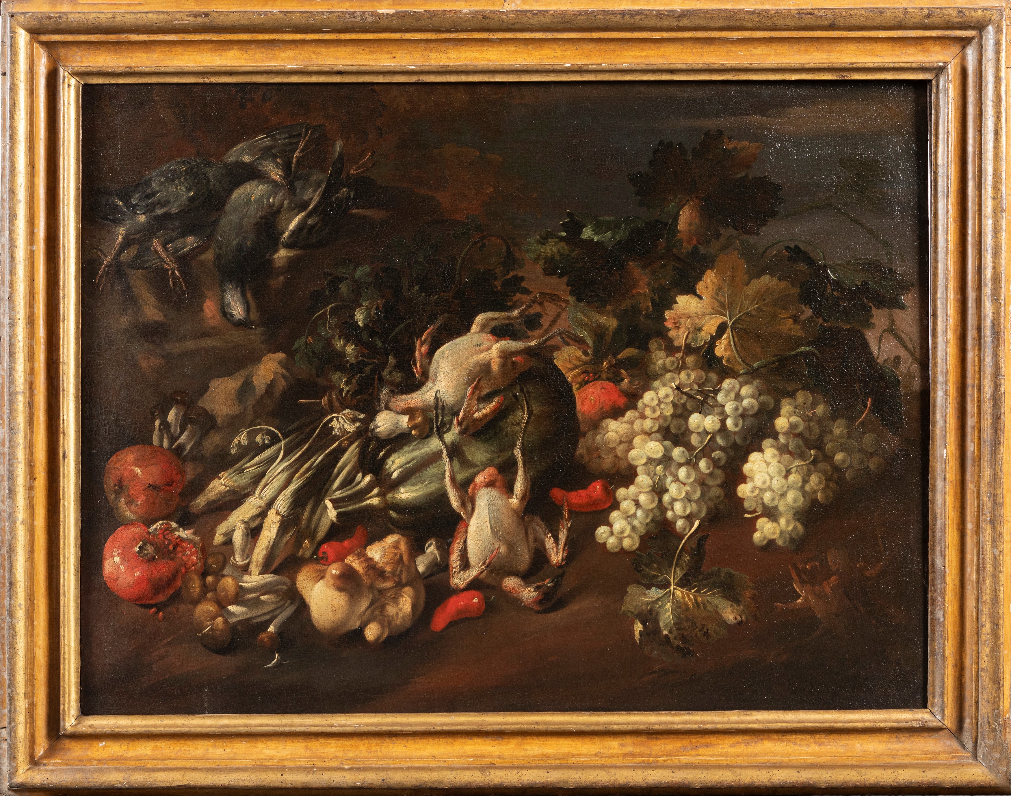 Pesci e funghi porcini presso un mastello di legno, con civetta e rana