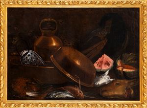 Interno di cucina con vasellame, pesci, anguria, gatto e pavone