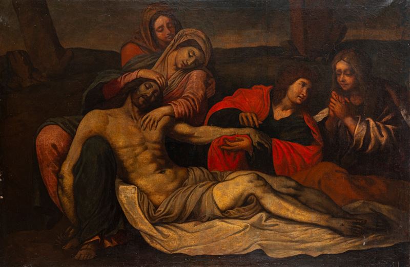 La composizione recupera il celebre prototipo di Annibale Carracci, noto come la Deposizione di Caprarola.