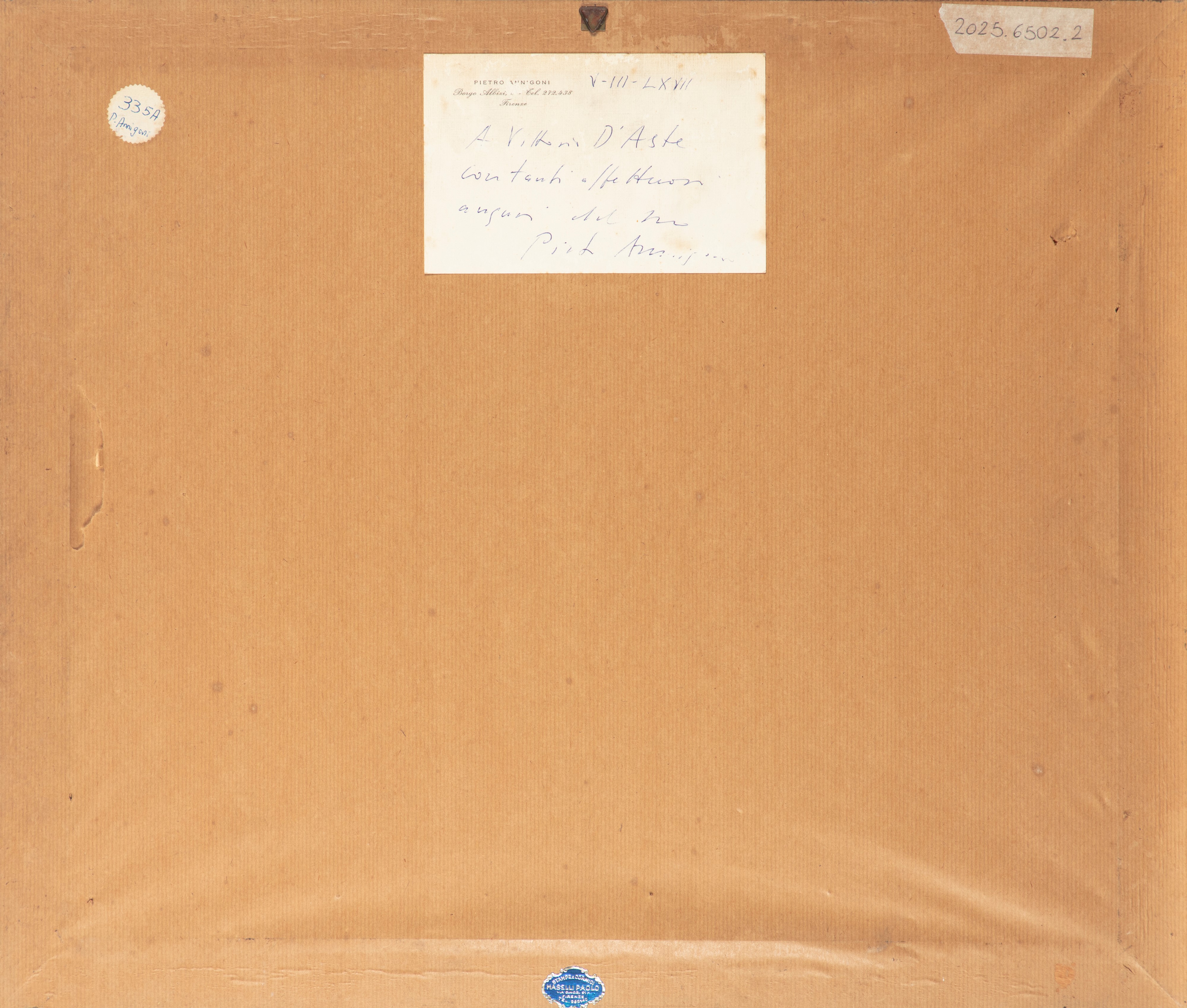 al retro, sulla carta di chiusura, etichetta del pittore con firma e dedica