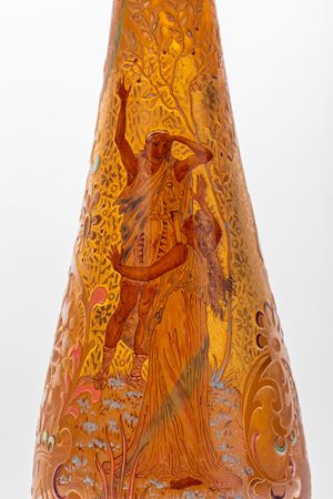 Vaso a goccia inciso ad acido dorato e smaltato con decoro mitologico