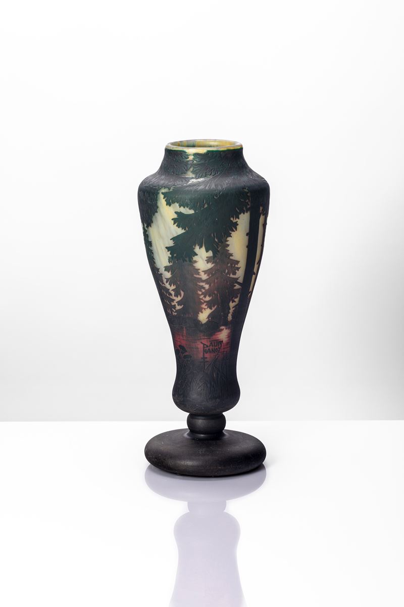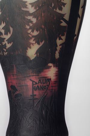 Vaso balaustro con piede anellato inciso ad acido doppio strato e decoro di paesaggio montano