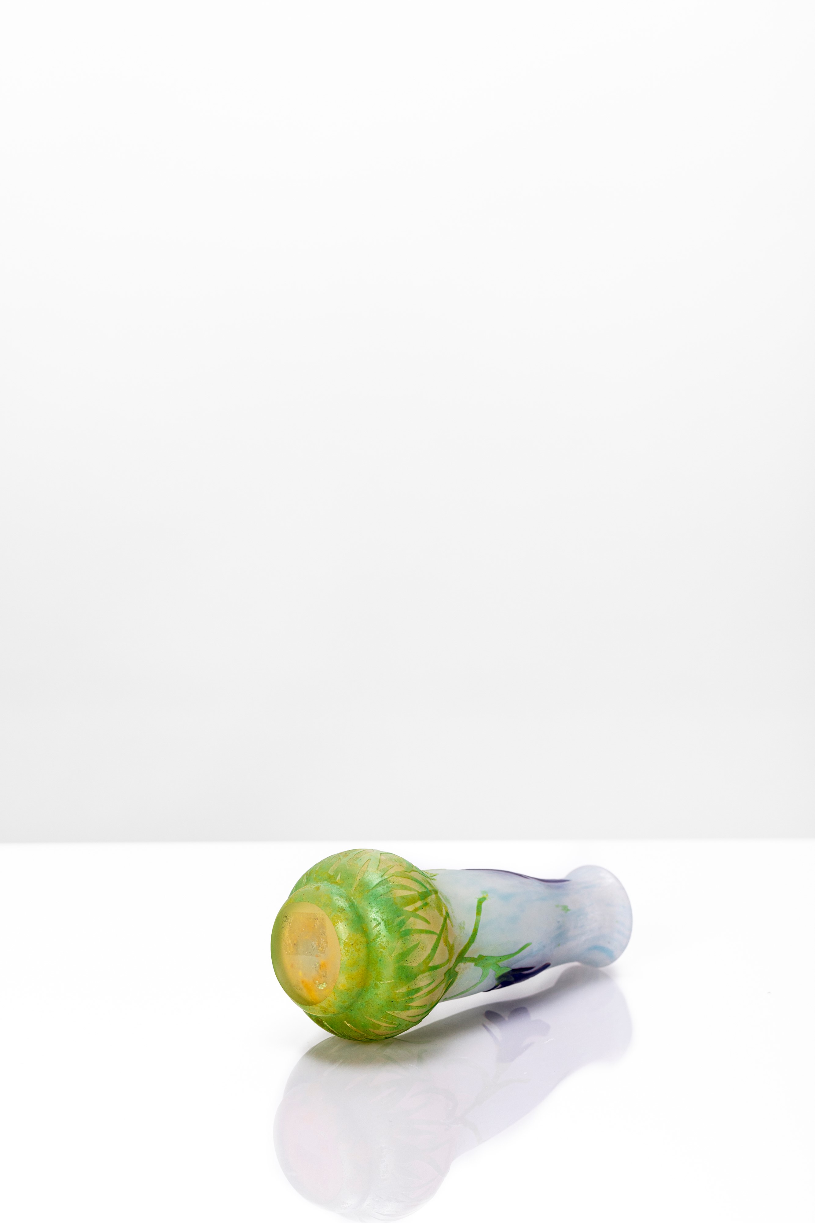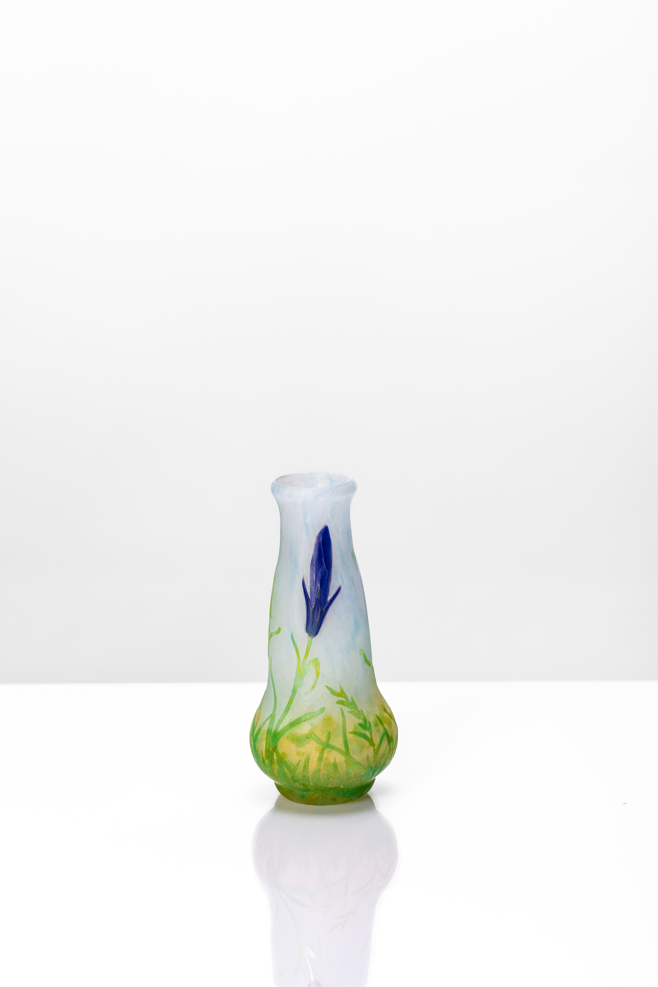 Vaso a bulbo rastremato verso l'alto inciso ad acido con decoro a germoglio e fiore di genziana