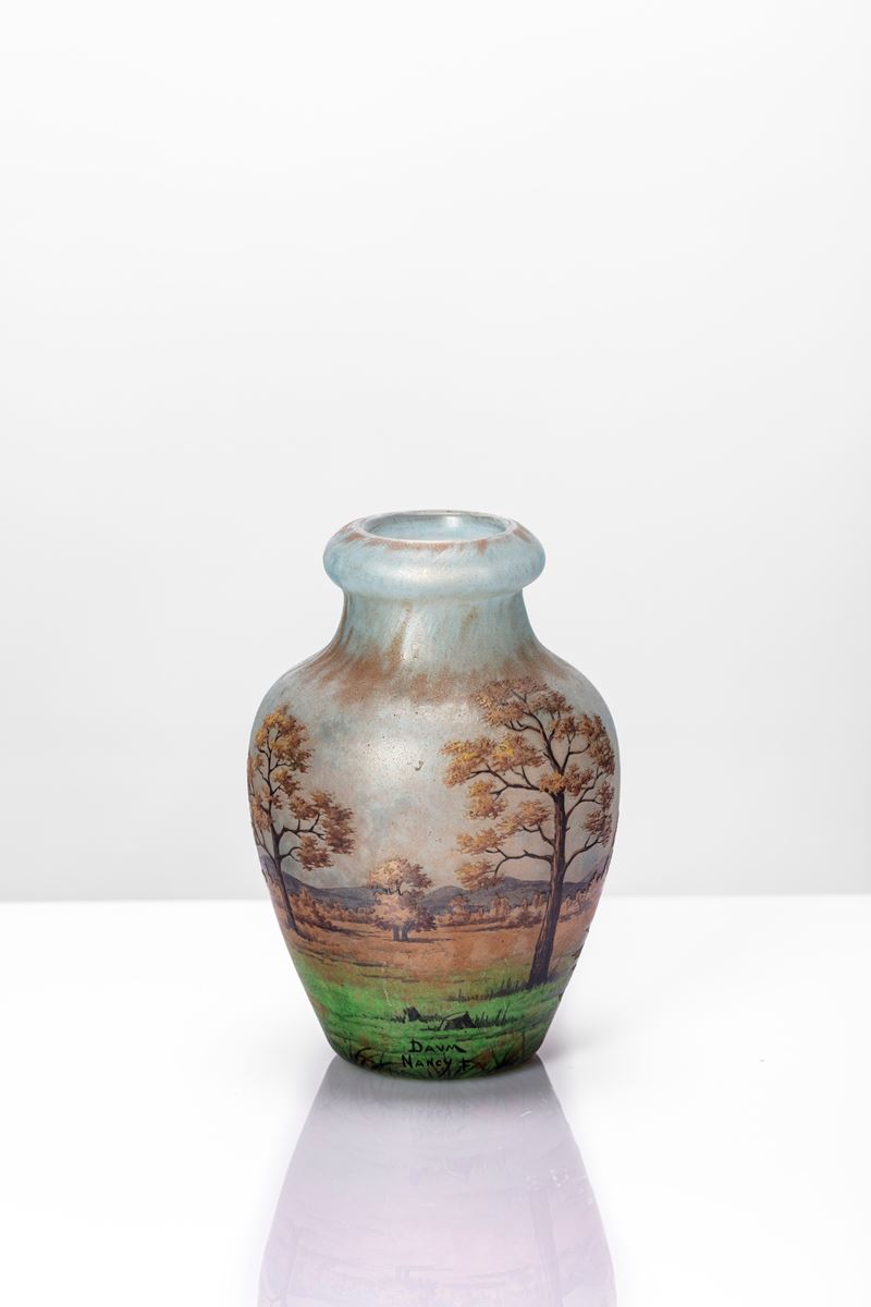 Vaso a pancia circolare inciso ad acido smaltato e collo anellato con decoro di paesaggio campestre