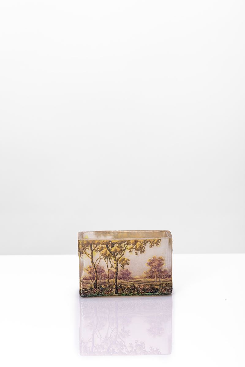 Vaso miniatura struttura rettangolare inciso ad acido con decoro alle polveri paesaggio di Lorena