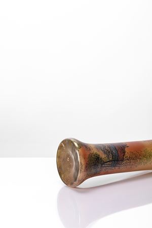 Vaso affusolato inciso ad acido con decoro di paesaggio con castello