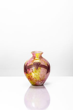 Vaso sferico con collo divergente inciso ad acido e patinato con tecnica intercalare a decoro geometrico