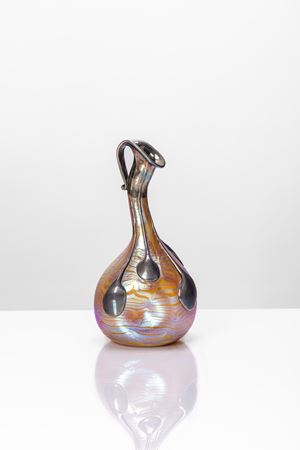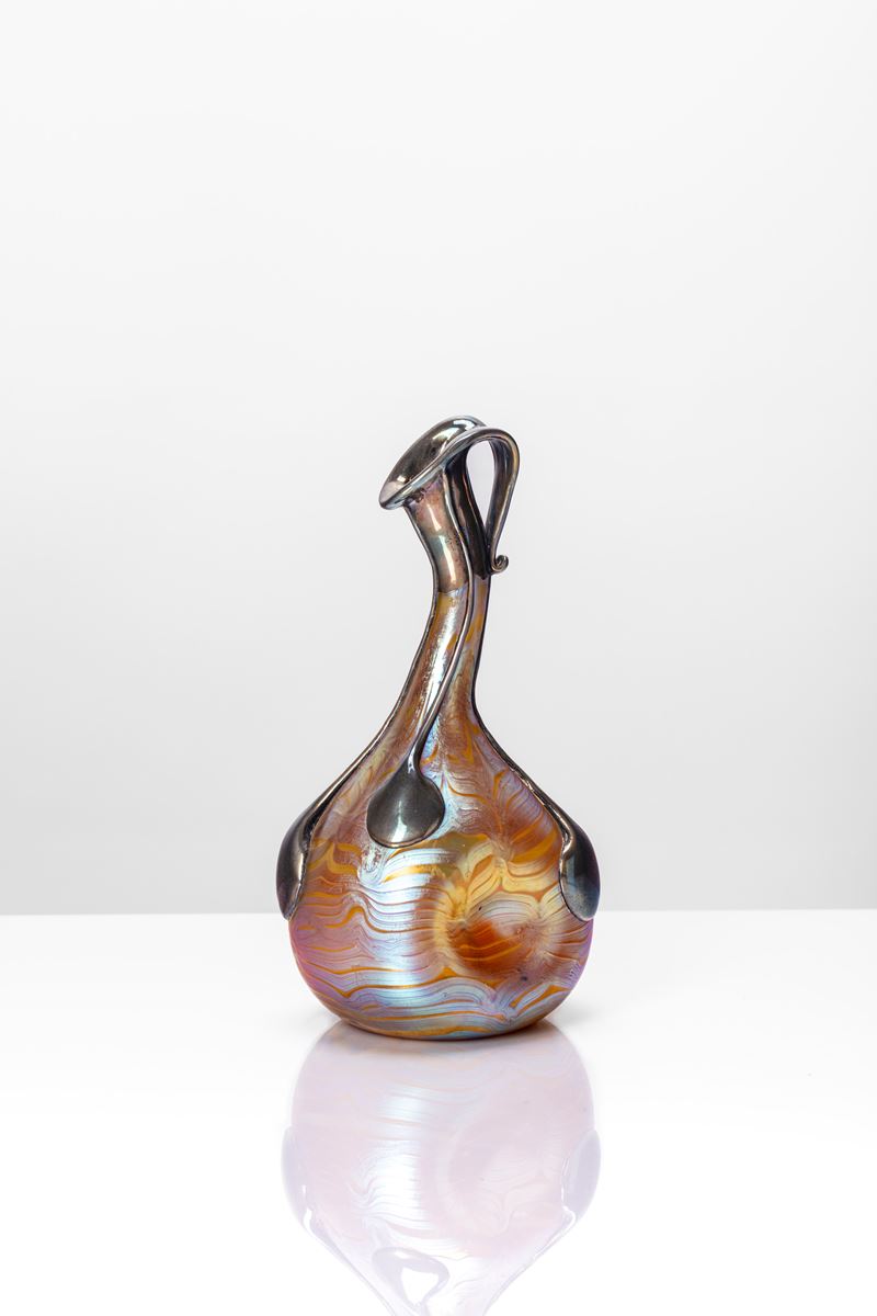 Piccolo versatoio a pancia bugnata inciso ad acido, con applicazione di cinque gocce in metallo argentato con ansa