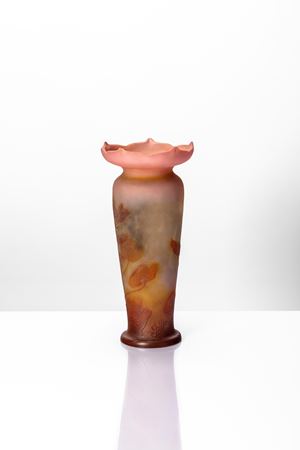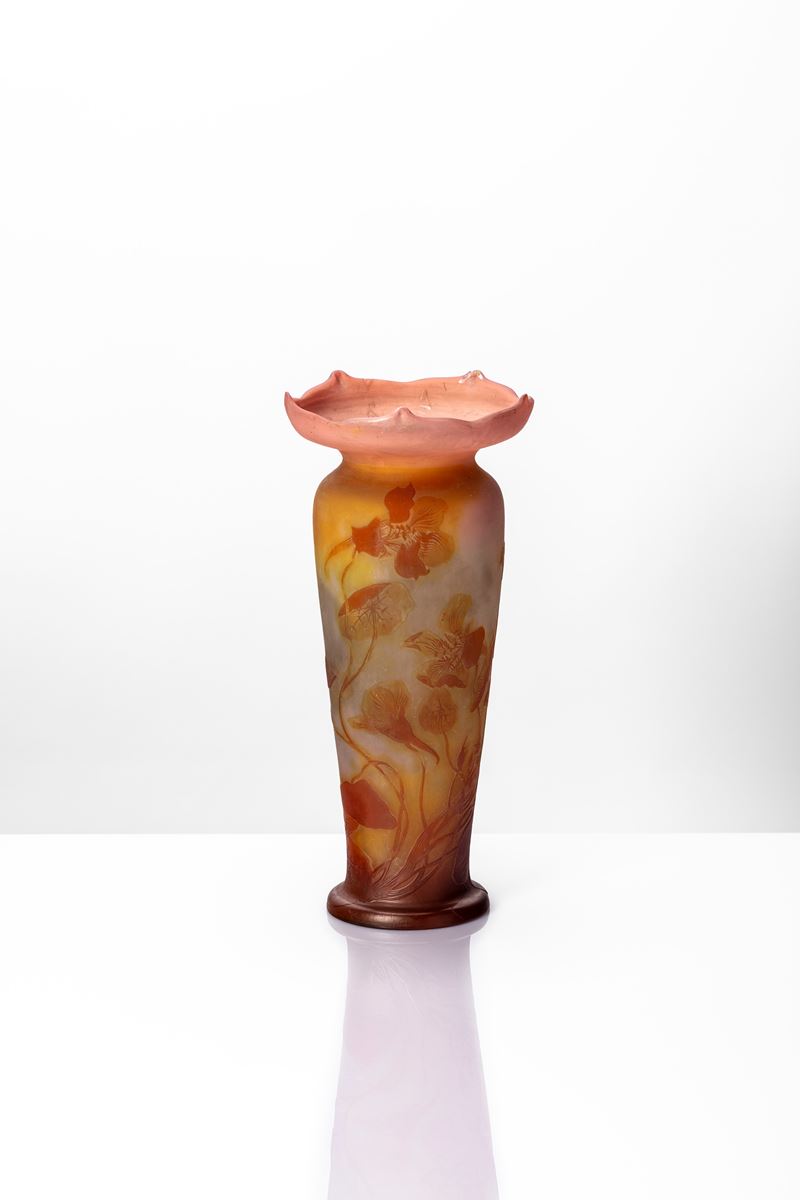 Vaso a collo corto e bordo alto divergente tirato alla pinza, finemente inciso ad acido con decoro a papaveri