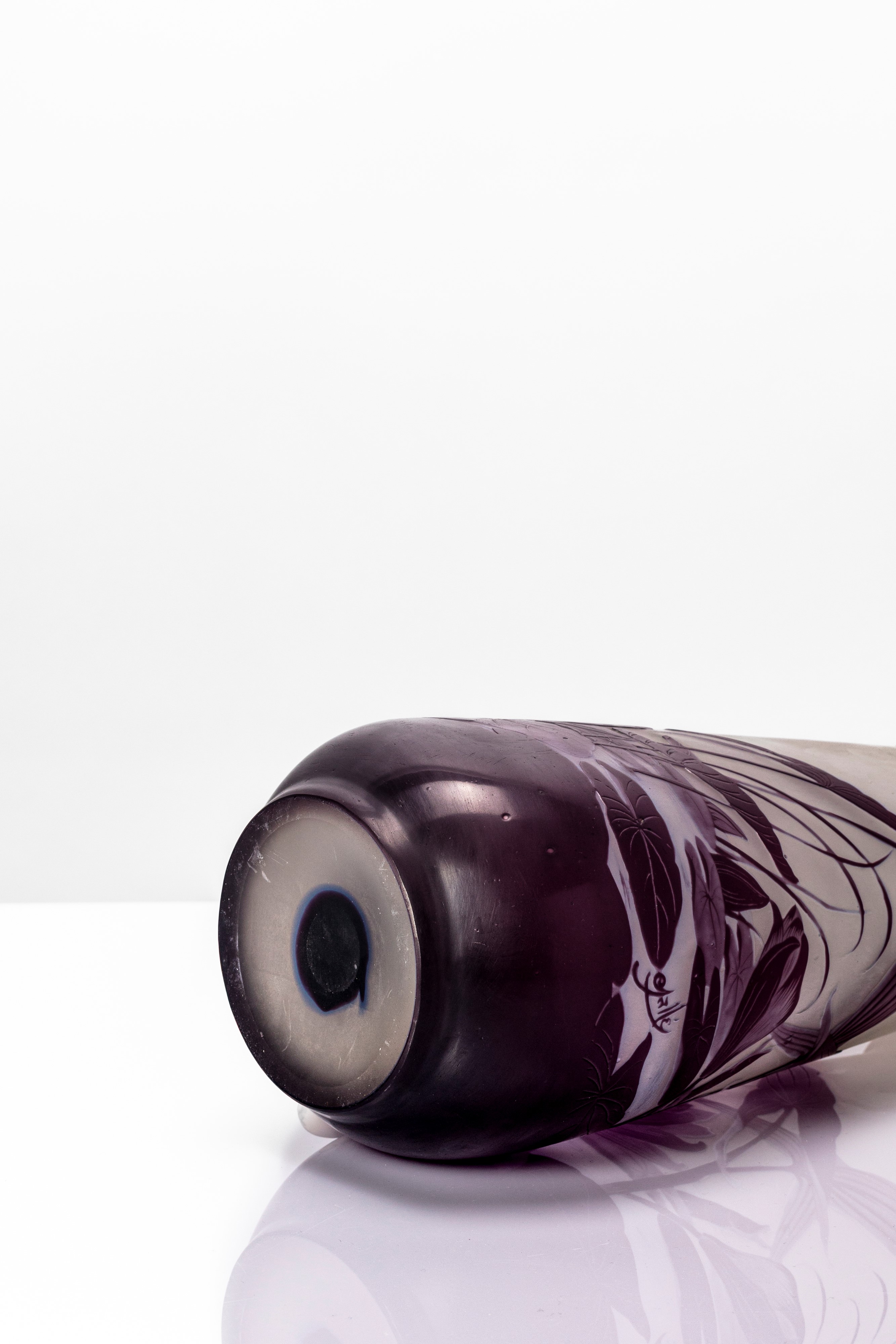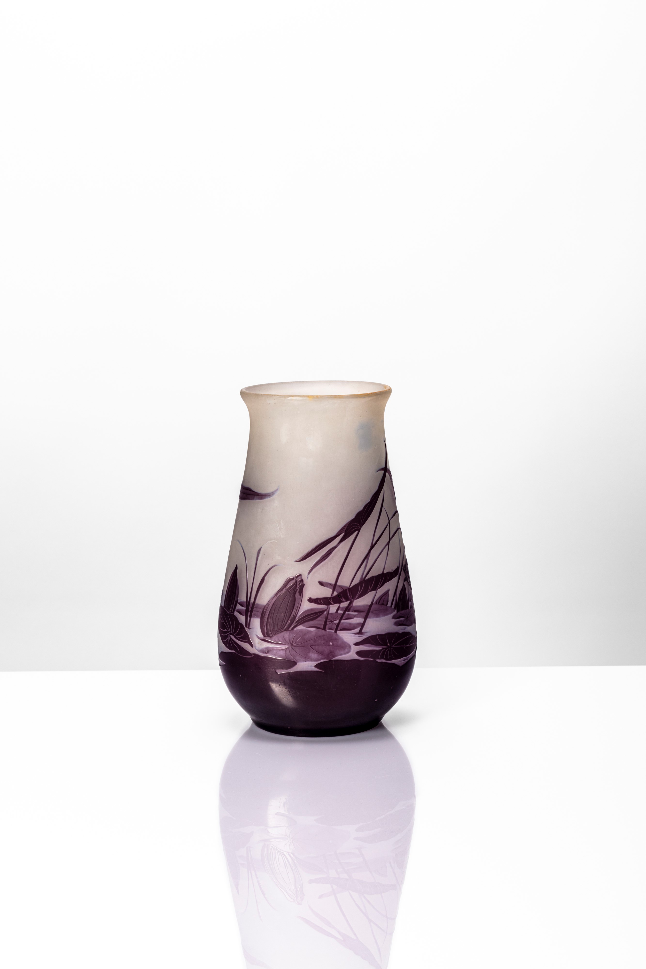 Vaso circolare a pancia schiacciata, rastremato verso l'alto ed inciso ad acido con decoro di ninfee nenupare