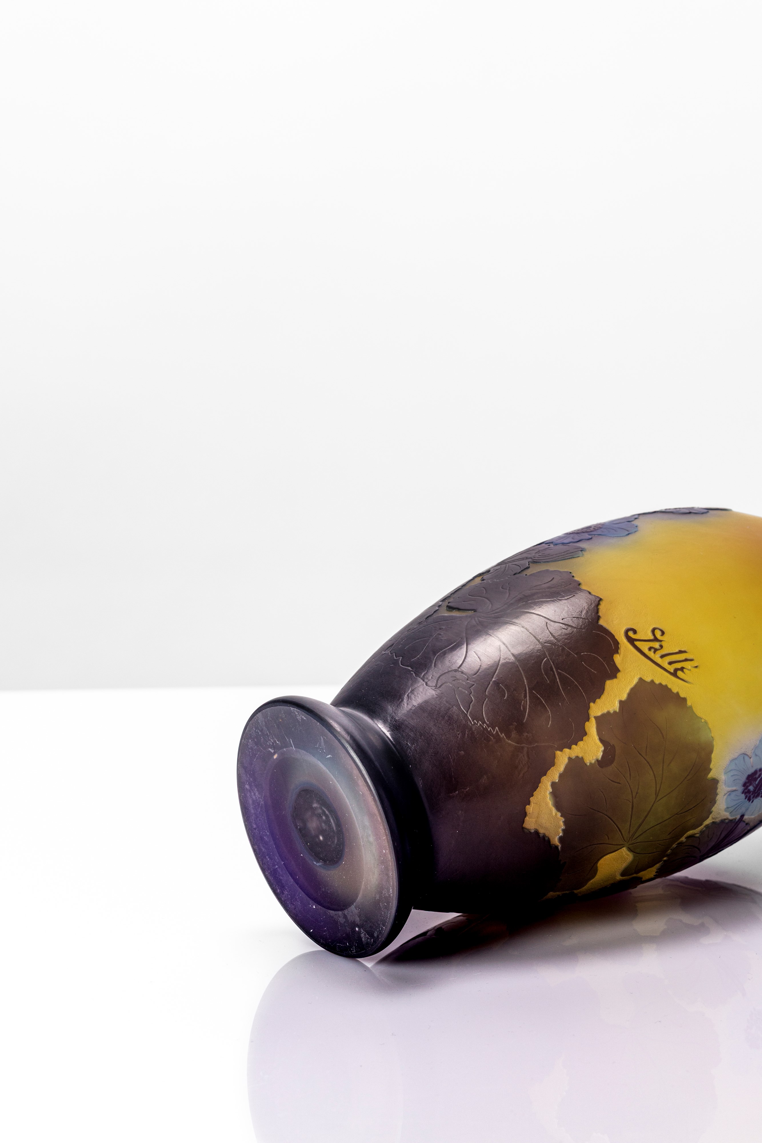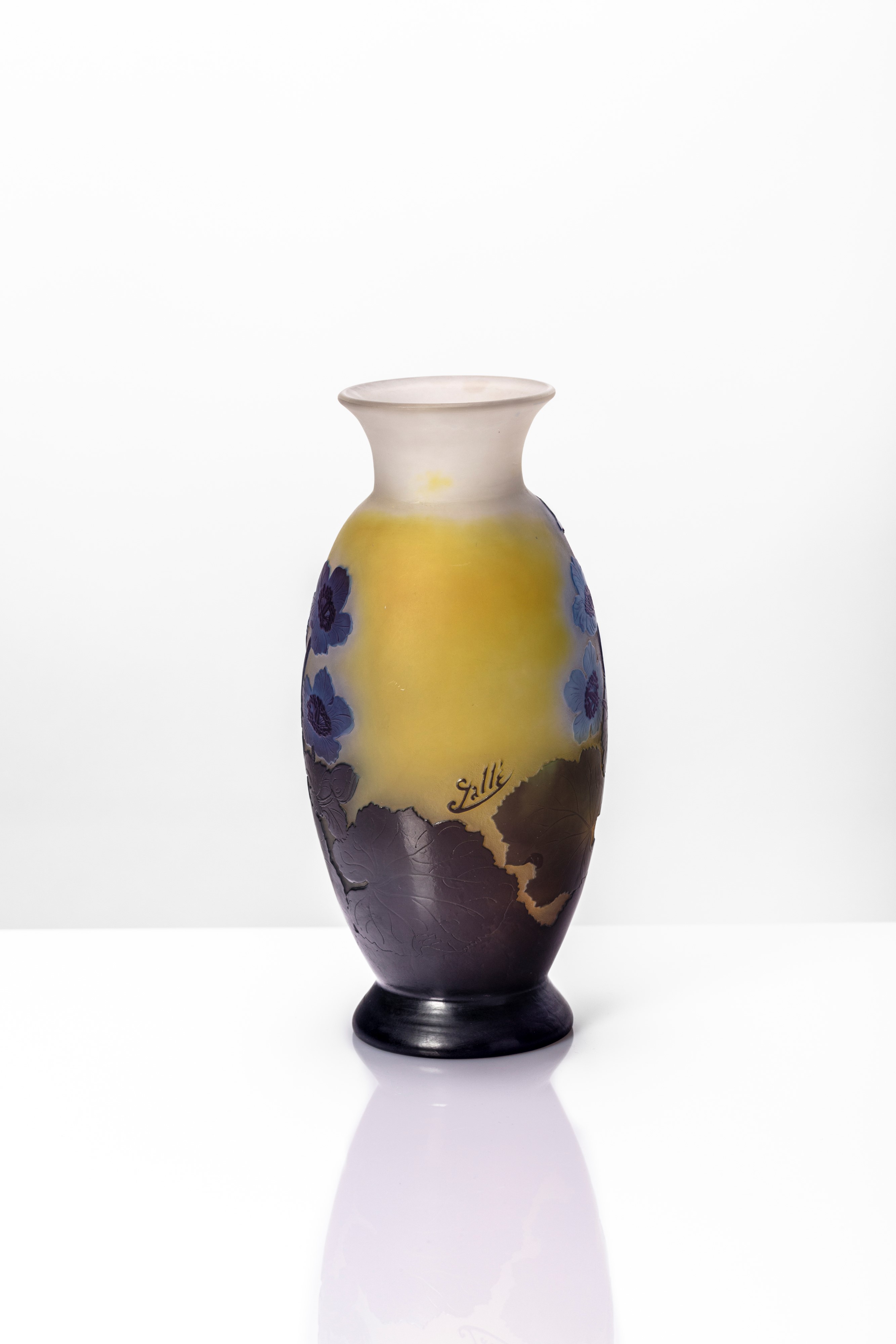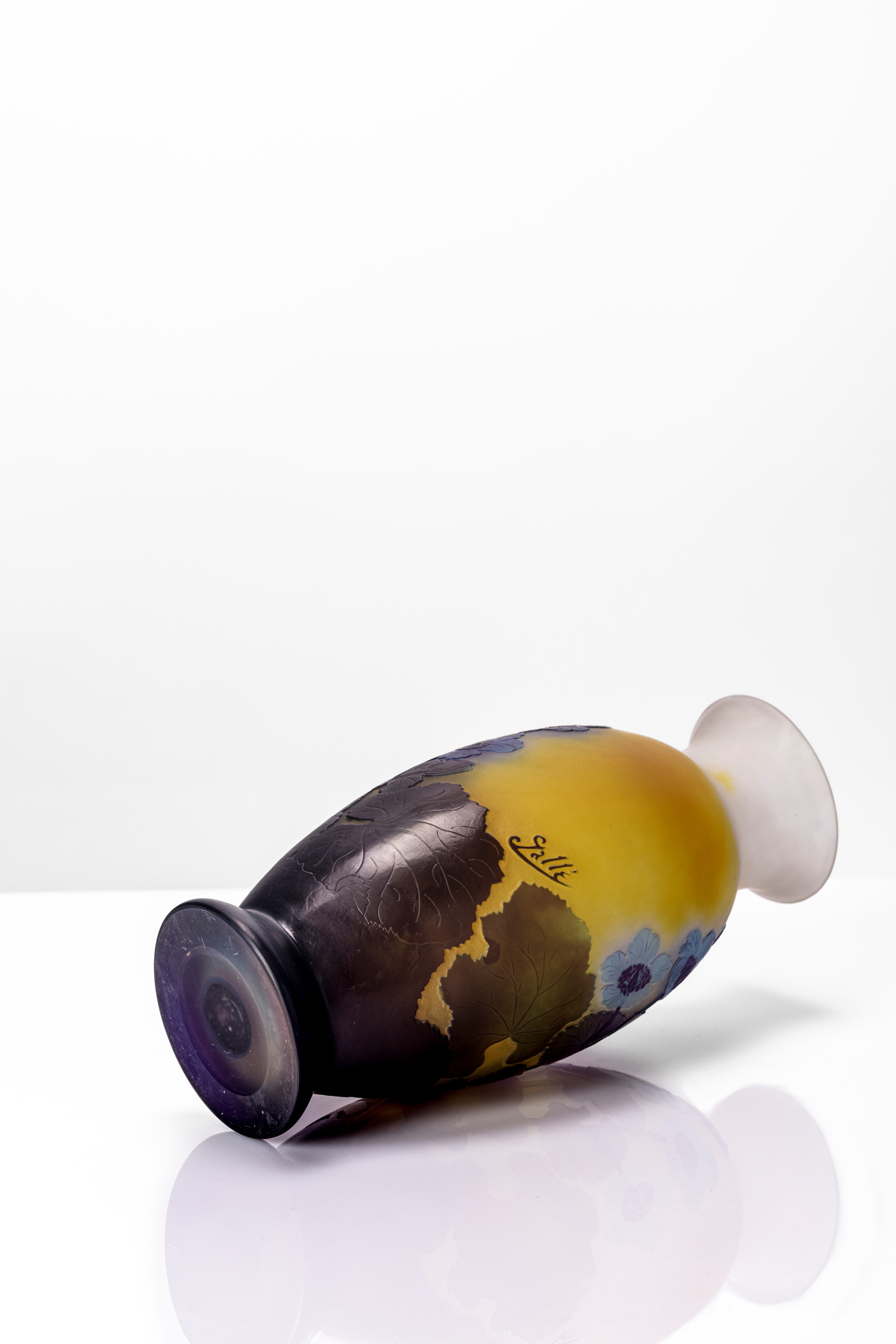 Vaso balaustro collo divergente inciso ad acido doppio strato con decoro di mammole