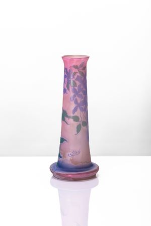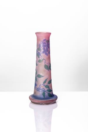 Vaso a tromba con orlo leggermente espanso inciso ad acido triplo strato con decoro di clematidi grandiflora