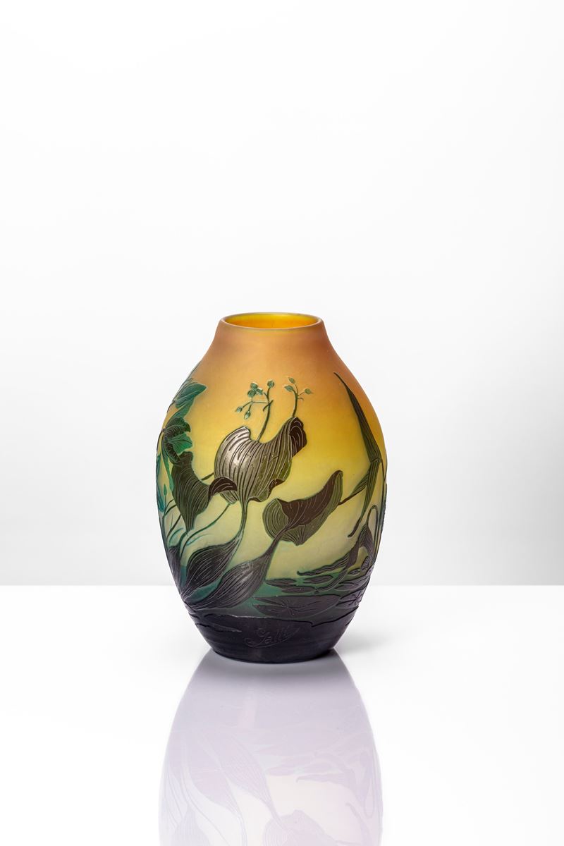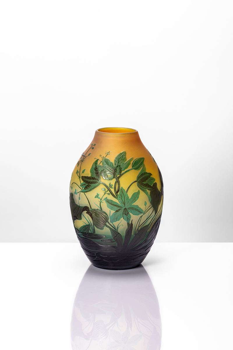 Vaso ovoidale inciso ad acido doppio strato con decoro di paesaggio acquatico e ninfee nenupare