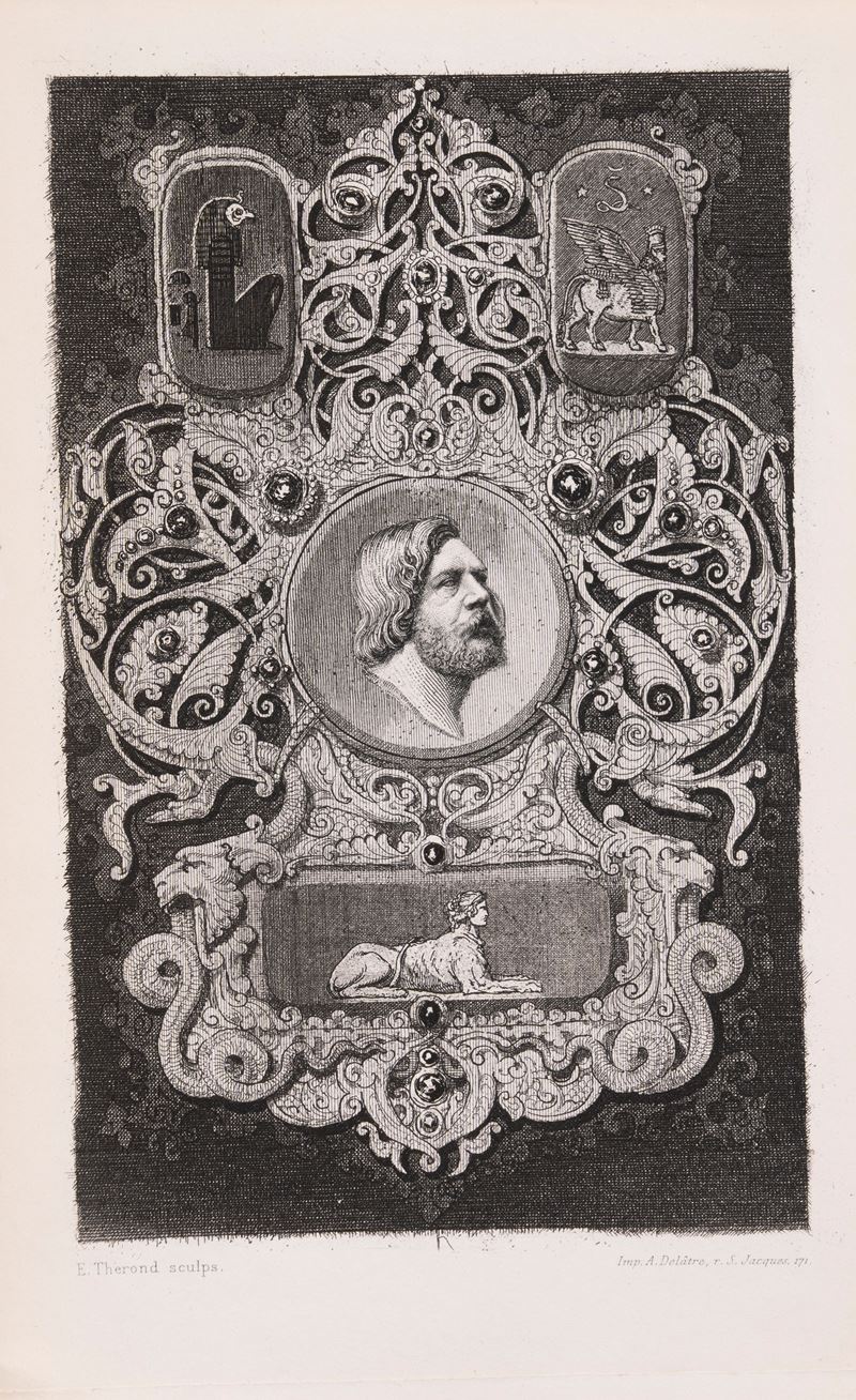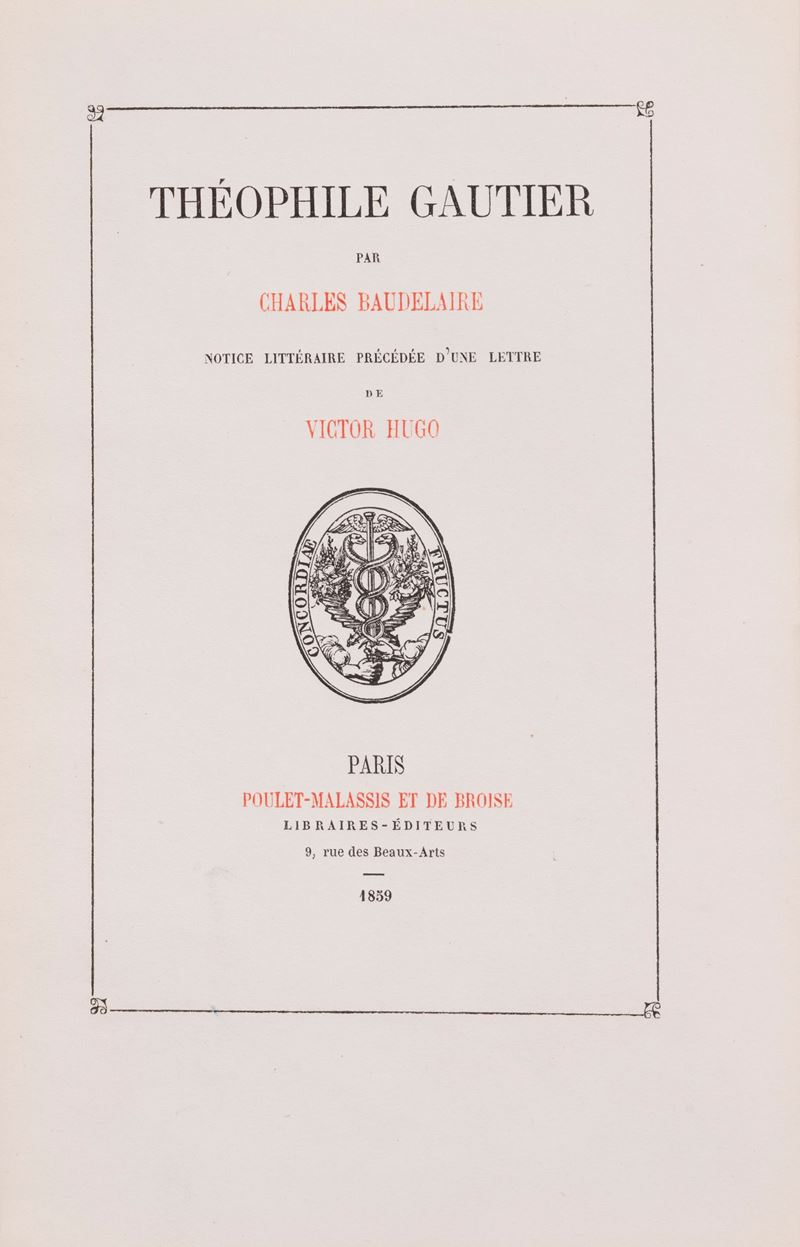 Paris, Poulet-Malassis et De Broise Libraires-Éditeurs, 1859 [novembre].  In 12°, Brossura originale, pp. [6: occhietto; incisione di Émile Thérond che raffigura Gautier in medaglione circondato da simboli esoterici; frontespizio] III [1] di prefazione, 68 di testo in riquadro tipografico, ESEMPLARE PERFETTO, conservato in elegante astuccio in cartonato.