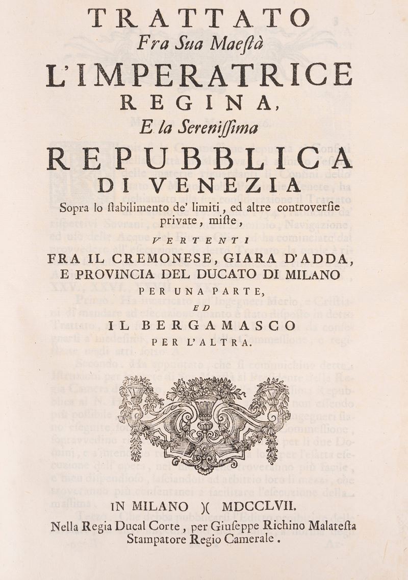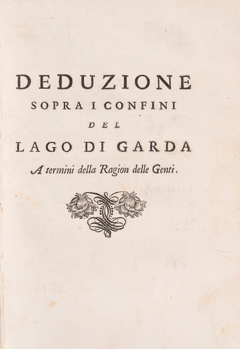 s.l., s.e, s.d; In 4°. Legato con Osservazioni sopra la scrittura austriaca che è intitolata Benacus, prodotta al congresso di Mantova per le vertenze del lago di Garda nell'anno 1756; legato con Deduzione sopra i confini del Lago di Garda a termini della Ragion delle Genti; legato con Risposta alla deduzione austriaca sopra i confini del Lago di Garda; Legato con Trattato fra sua Maestà l'Imperatrice Regina e la Serenissima Repubblica di Venezia sopra lo stabilimento de' limiti ed altre controversie private, miste vertenti tra il cremonese, Giara d'Adda e provincia del Ducato di Milano per una parte, ed il bergamasco per l'altra, Milano, Giuseppe Richino Malatesta, 1757; Legatura coeva in pergamena rigida, titolo in oro entro tassello al dorso, lievi difetti. Annotazioni manoscritte alla carta di guardia