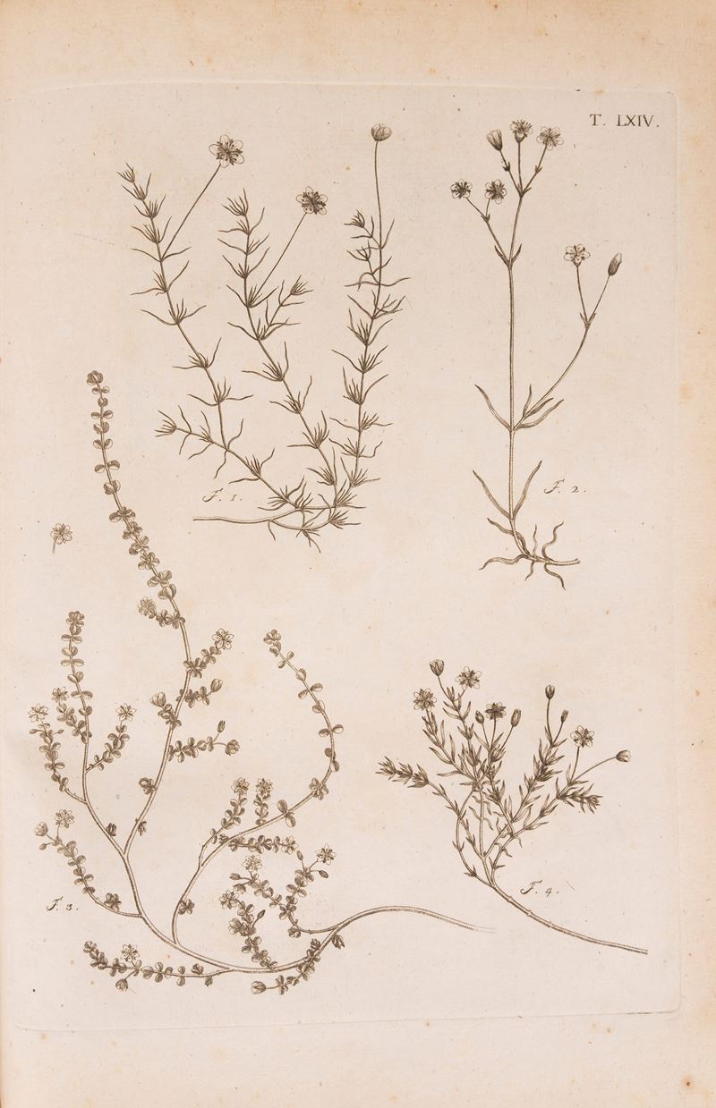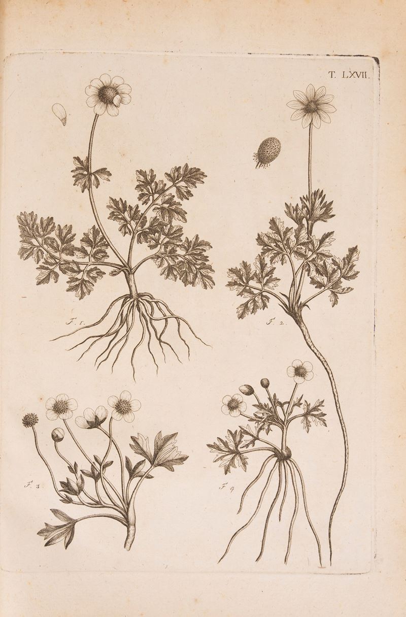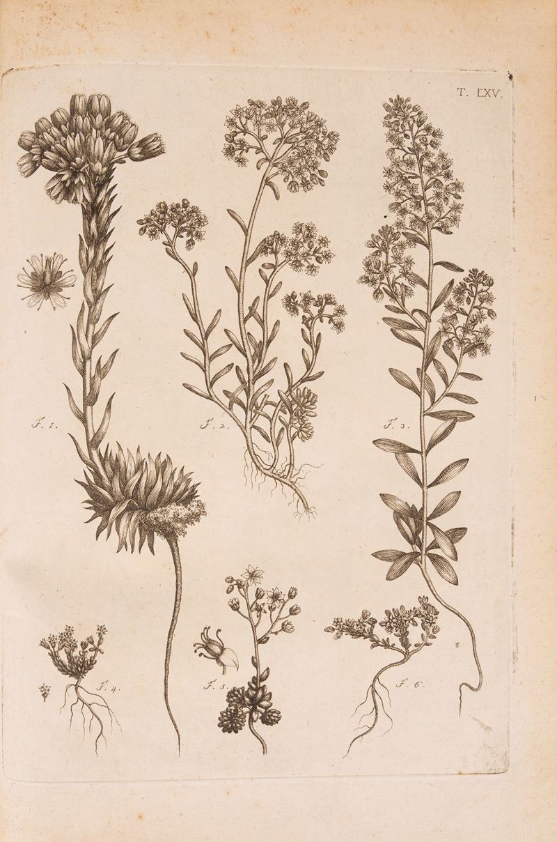 Prima edizione di una splendida pubblicazione sulla flora delle montagne e delle vallate del Piemonte illustrata da 92 tavole botaniche incise in rame di grande bellezza decorativa e importanza scientifica, opera del grande scienziato e botanico Carlo Allioni (Torino, 1728-ivi, 1804). Saccardo, La botanica in Italia, I, pag. 13: "Carlo Allioni, medico torinese (1728-1804), fu professore di quell'Università e direttore dell'Orto Botanico dopo il Donati… L'opera che gli fece più onore fu la "Flora Pedemontana" pubblicata nel 1785, della quale i primi due volumi contengono la descrizione di 2800 piante, e l'ultimo da la figura di 275 specie esattamente disegnate, col luogo della nascita, le qualità del suolo, il nome vernacolo piemontese e la facoltà medicinali di esse piante…". Pritzel, 108. Nissen, 18. Manno, I, 5233. Brunet, I, 190-191. Graesse, I, 81. Sacheverell Sitwell e Wilfrid Blunt, Grandi libri di fiori, p. 69. Dunthorne, 6. Stafleu, 100. Cfr. Mario Gliozzi in D.B.I., II, 1960: "Gli studi botanici culminarono nell'opera massima, la Flora Pedemontana del 1785, seguita nel 1789 dall'Auctarium, con la descrizione di circa 3000 piante, molte delle quali descritte per la prima volta. La poderosa opera, tuttora fondamentale per lo studio della flora piemontese, poneva l'A. tra i massimi botanici d'Europa, procurandogli l'appellativo di Linneo piemontese."