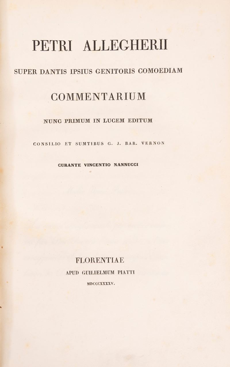 Imola, Tipografia Galeati, 1855. In 4°. 3 voll. Legatura coeva in piena tela marrone. § Commento di Francesco da Buti sopra la Divina Comedia. Pisa, Fratelli Nistri, 1858. In 4°. 3 voll. Legatura in mezza pelle verde e cartone marmorizzato, dorso parzialmente staccato. § Petri Allegherii Super Dantis ipsius genitoris Comoediam Commentarium. Firenze, G. Piatti, 1845. In 4°. Legatura coeva in pergamena rigida con decorazioni in oro ai piatti e al dorso, tagli dorati. Esemplare G. Martini.