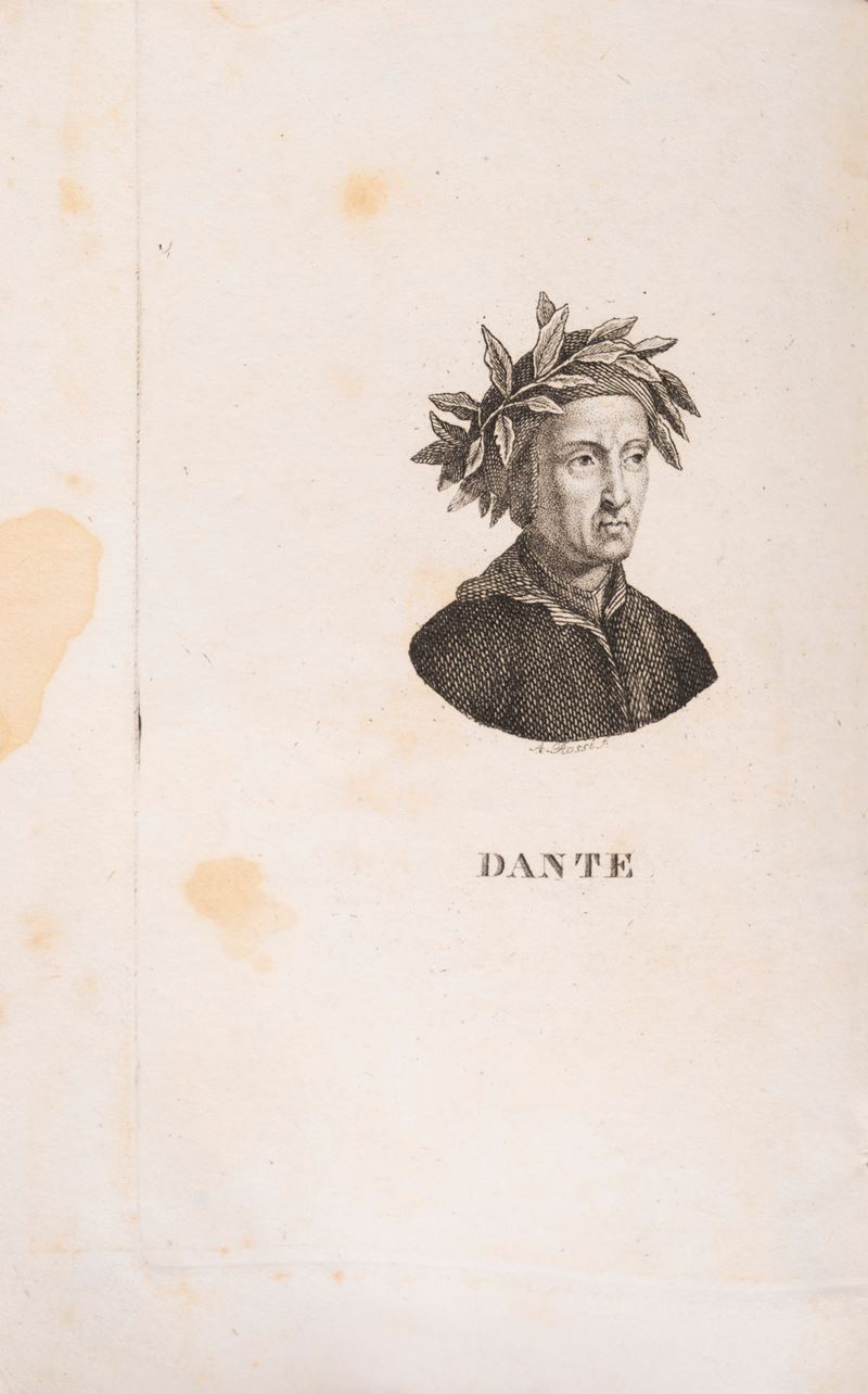 Napoli, a spese del Nuovo Gabinetto Letterario, 1827. In 16°. 3 voll. Ritratto di Dante in antiporta, tre tavole ad inizio cantica, esemplare in barbe e intonso, brossura editoriale. § La Commedia di Dante Alighieri esposta in prosa e spiegata nelle sue allegorie dal Prof. Luigi De Biase. Napoli, Antonio Morano, 1886. In 8°. Bruniture, legatura in piena pergamena maculata.