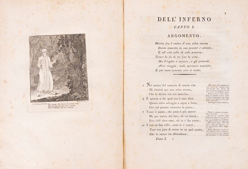 Bologna, Gamberini e Parmeggiani, 1826. In 4°. 3 voll. Pregevole edizione arricchita da 101 tavole già «inventate ed intagliate» dall’artista tra il 1806 e il 1807. Giuliano Mambelli, bibliografo e redattore degli Annali di bibliografia dantesca, scrive che in questa edizione i rami di Macchiavelli furono ritoccati per ordine della Curia, «onde toglierne la nudità», fioriture marginali, legatura coeva in mezza pelle marrone e cartone, difetti e mancanze.