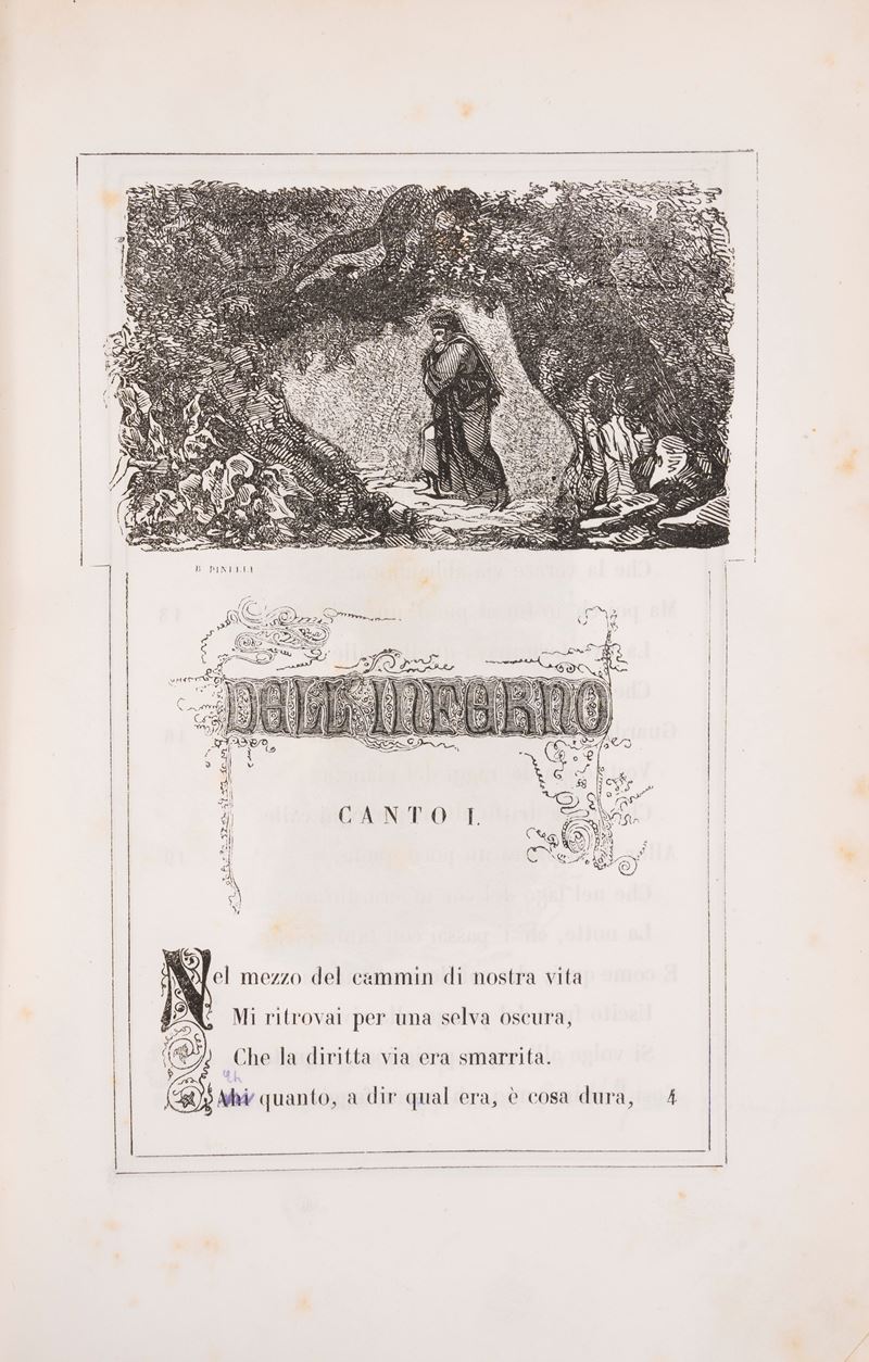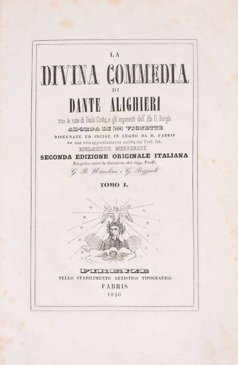 Graziosa e nitida edizione in carta lustrata appositamente fabbricata, pubblicata a fascicoli. Riproduce gli "Argomenti del Borghi e le "Note" di Paolo Costa, che stanno in fine d’ogni Canto. Nel testo si seguì l’edizione data dal Lombardi; e la correzione della stampa fu affidata a P.J. Fraticelli. Le vignette, che in parte sono copia dei notissimi lavori del Flaxman, del Pinelli, dell’Ademollo, ec. furono disegnate ed incise dal Fabris, dal Balestrieri, dalla sig. Elisa Mariani, da G.B. Biscarra ed altri. Il volume che reca l’Inferno, incomincia con un discorso di P. Fraticelli sopra la prima e principale allegoria del Poema.