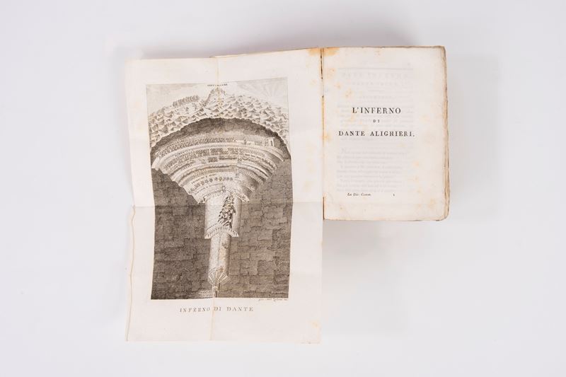 Venezia, Gaspari Tipografo, 1827. In 16°. Edizione col solo testo eseguita su quella di Comino del 1727, per cura di Lorenzo Pezzana. Con la Vita di Dante di Leonardo Aretino e gli Indici di G.A. Volpi, ritratto del poeta in antiporta ad opera di Zuliani, tre tavole ripiegata ad inizio di ogni Cantica a rappresentarne la struttura, legatura in cartoncino moderna. § La Divina Commedia di Dante Allighieri. Venezia, Girolamo Tasso, 1829. In 16°. Esemplare in barbe, con la sua cartonatura originale.