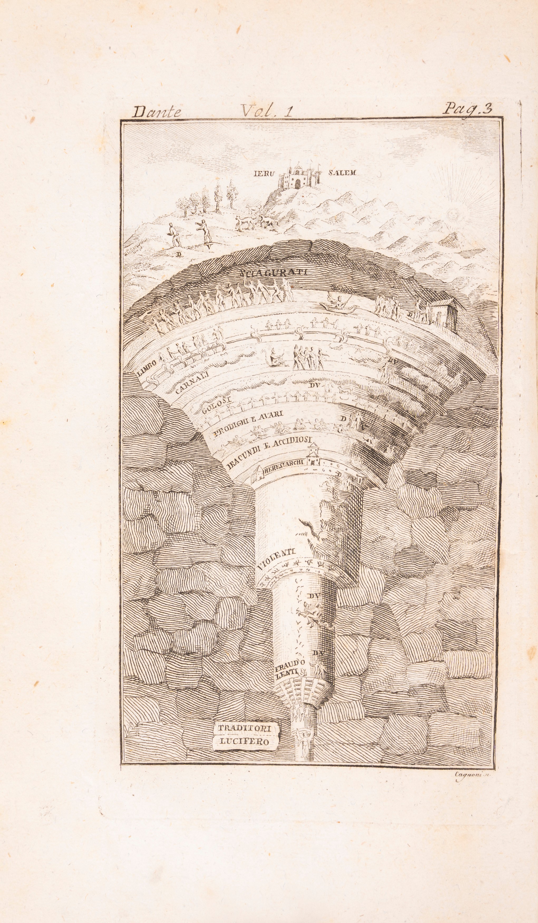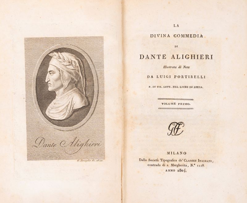 Milano, Dalla Società Tipografica de' Classici Italiani, 1804. In 8°. Tre volumi. Ritratto di Dante disegnato ed inciso in rame da Giuseppe Benaglia all'antiporta fuori testo del vol. I e 3 tavole in rame fuori testo incise dal Cagnoni raffiguranti i 3 regni, marginali fioriture, legatura coeva in mezza pelle nocciola e carta marmorizzata, tagli a spruzzo. Ex libris Laurentii Amione. «Edizione assai stimata e la prima fatta in Italia nel secolo XIX. Reca la vita di Dante scritta dal Tiraboschi», Mambelli 88.