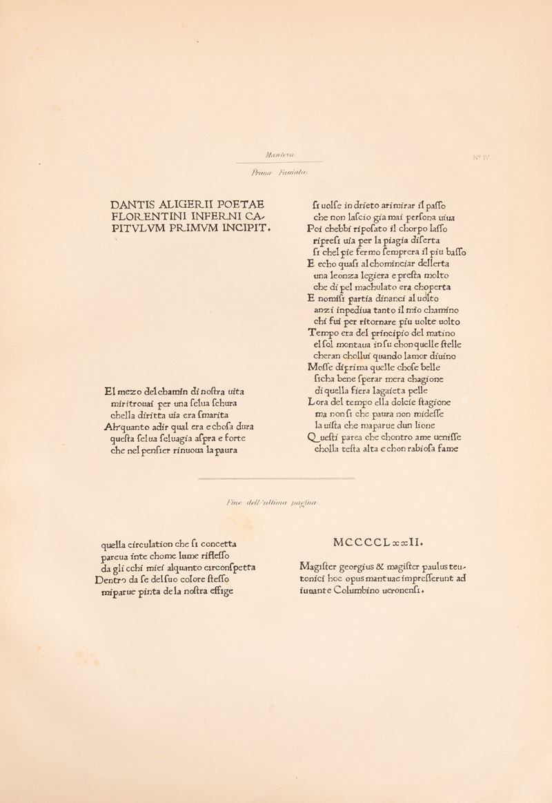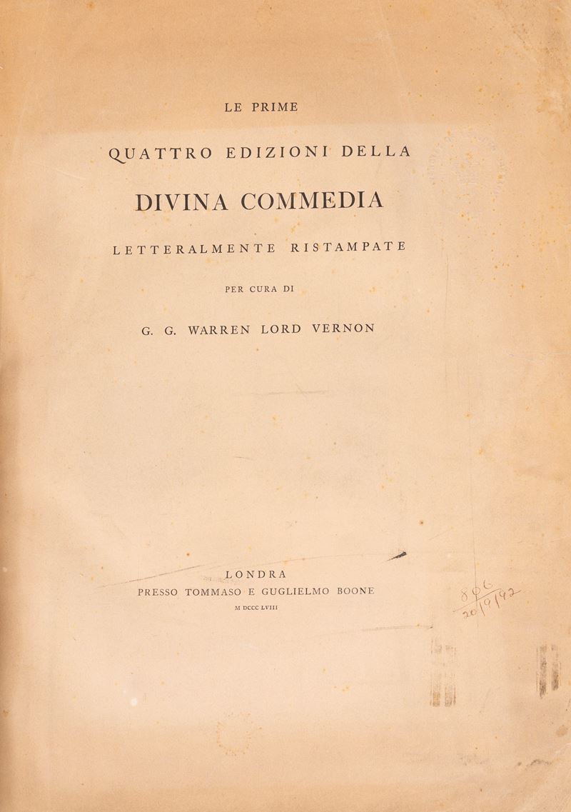 Londra, Tommaso e Guglielmo Boone, 1858. In 2°, 380 x 270 mm. Legatura coeva in mezza pelle marrone e tela verde. Carta di dedica "Ai Signori Accademici della Crusca questa edizione della Divina Commedia ristampata parola per parola dalle prime di Foligno Jesi Mantova e Napoli in segno di altissima stima offre il loro umile collega. Londra 1 Agosto 1858. Vernon"; contiene 5 tavole con riprodotti facsimili delle varie edizioni citate.