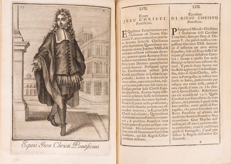Roma, nella stamperia di Giorgio Placco intagliatore, 1711. In 4°. Doppio frontespizio in latino e italiano e incisione in rame in antiporta di allegoria con figura alata che suona la tromba, stemma militare e titolo entro cartiglio, timbro di appartenenza al frontespizio, con numerose tavole incise a piena pagina con titolo, testo in doppia colonna e doppia lingua italiano/latino. Legatura di epoca successiva in pelle rossa, piatti inquadrati da cornice dorata, titolo impresso in oro al dorso a quattro nervi, lievi difetti. Ex libris al contropiatto "James Lorimer Graham".