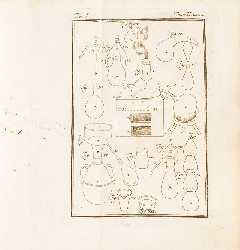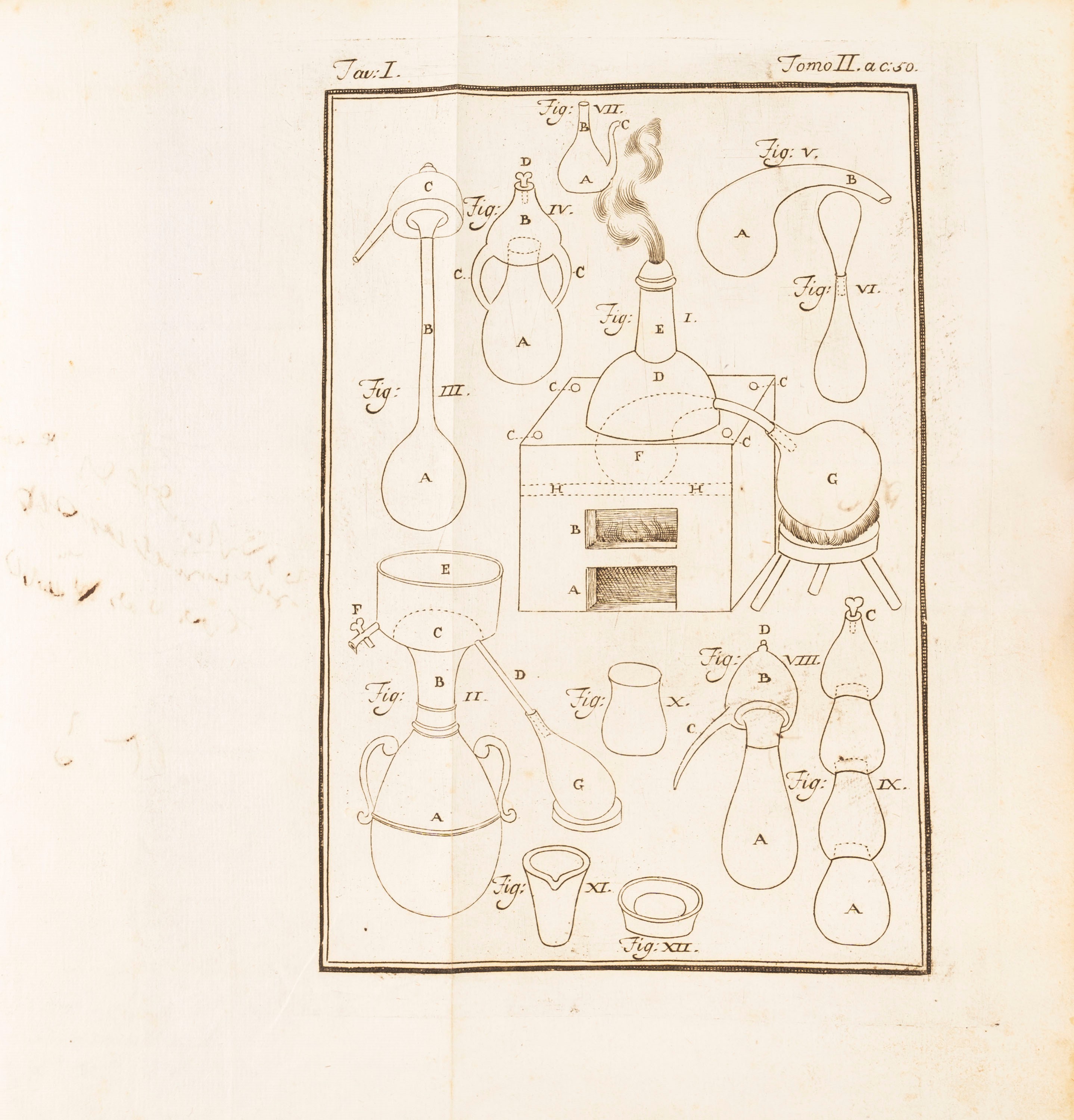Siena, Luigi e Benedetto Bindi, 1777. In 4°. 2 voll. Marca ai frontespizi, con una carta ripiegata che raffigura alambicchi, dedica al Cavalier Francesco Siminetti entro cornice tipografica, testatina ed iniziale incisi in rame, lievi fioriture e arrossature, legatura coeva in piena pergamena rigida, titolo manoscritto al dorso, qualche macchia, lievi difetti. Firma di appartenenza alla carta di guardia.