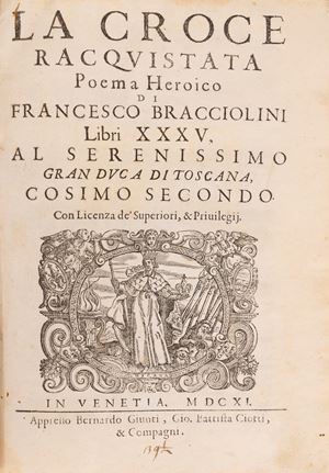 Venezia, appresso Bernardo Giunti, Gio. Battista Ciotti & Compagni, 1611. In 4°. Marca tipografica al frontespizio, numerosi capilettera e testatine xilografiche, testo in colonne. Legatura in piena pergamena, titolo in oro al dorso. Ex libri Marchese Caracciolo.