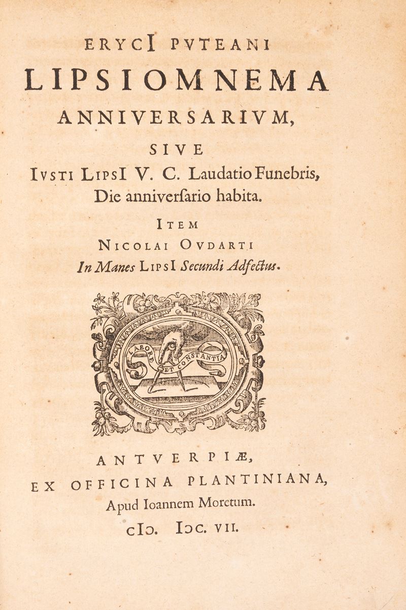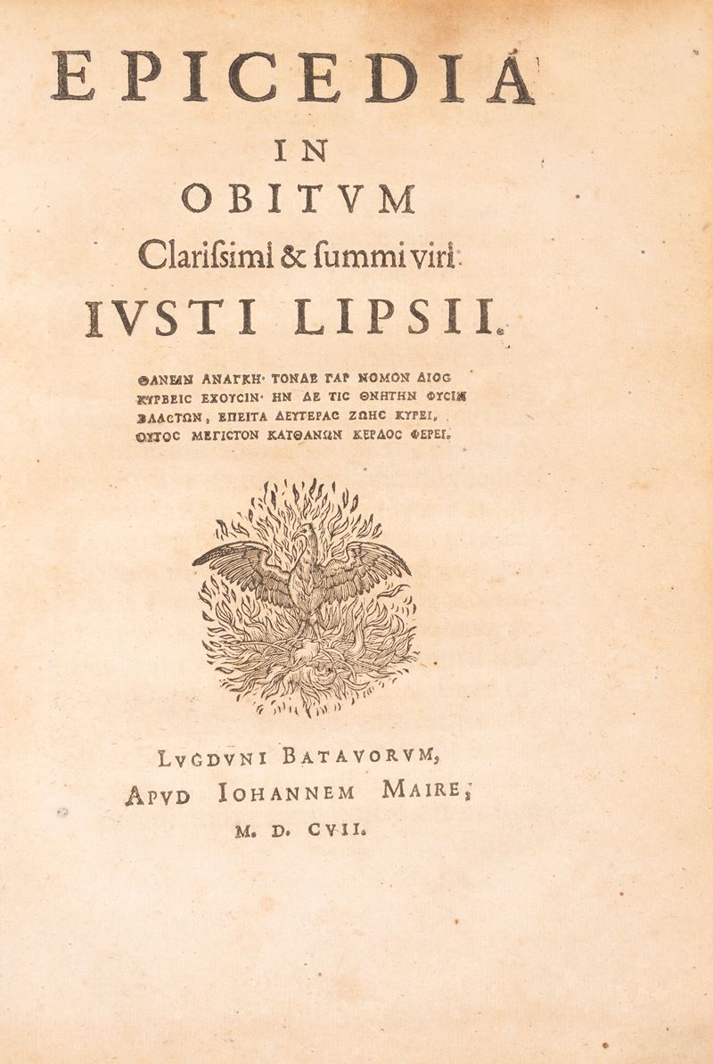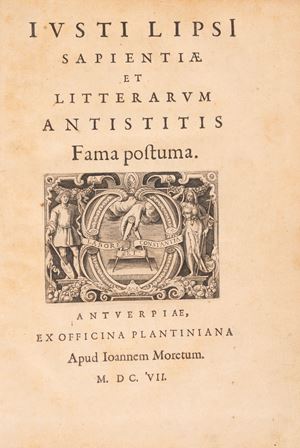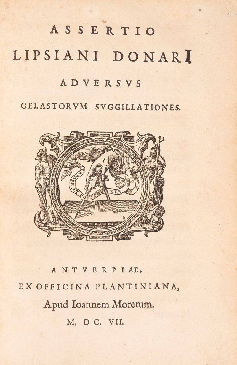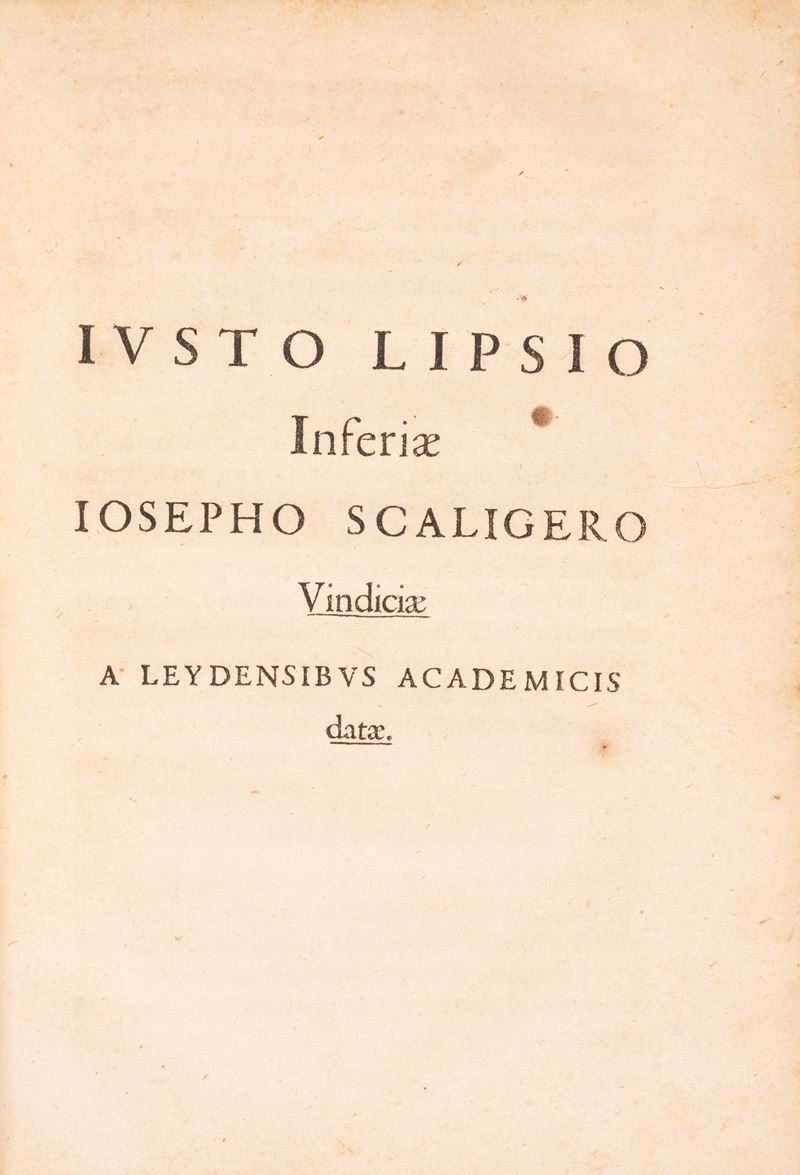 Antuerpiae, ex Officina Plantiniana, apud Ioannem Moretum, 1607. In 4°. Vigneta calcografica al frontespizio recante iscrizione "labore et constantia", corpo leggermente staccato dal dorso. Legatura in pergamena, titolo al dorso. § Rilegato con: Assertio Lipsiani Donari adversus gelastorum suggillationes. Antuerpiae, ex Officina Plantiniana, apud Ioannem Moretum, 1607. Vignetta calcolagrafica al frontespizio, capilettera decorati. § Iusto Lipsio Inferiae Iosepho Scaligero, Antuerpiae, ex Officina Plantiniana, apud Ioannem Moretum, 1607. § Epicedia in obitum, Antuerpiae, ex Officina Plantiniana, apud Ioannem Moretum, 1607. Vignetta xilografica al frontespizio. § Woveri Ioannis, Antuerpiensis Eucharisticum clarissimo et incomparabili viro iusto lipsio scriptum, Antuerpiae, ex Officina Plantiniana, apud Ioannem Moretum, 1603. Marca calcografica al frontespizio.
