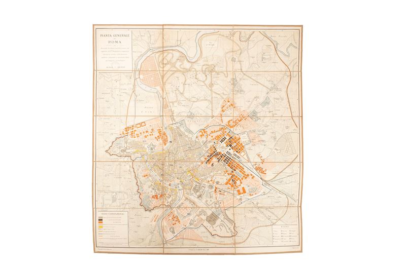 Carta topografica a colori stampata a Roma dallo Stabilimento cartografico C. Virano, 1889, di cm 87 x 79, composta di 12 fogli montati su tela entro custodia cartonata con dorso in mezza pelle e titolo impressi in oro.