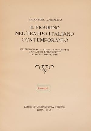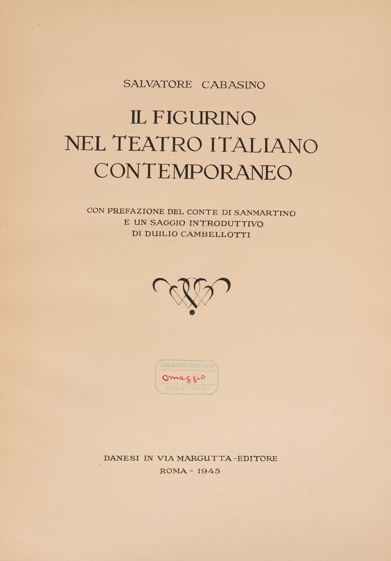 Roma, Danesi in Via Margutta - Editore, 1945. In folio, timbro di appartenenza al frontespizio "Paolo Crepas", illustrazioni in bianco e nero e tavole fuori testo a colori. Legatura in cartoncino editoriale con disegno originale al piatto superiore, strappo all'angolo superiore sinistro. Esemplare N. 895/1000.
