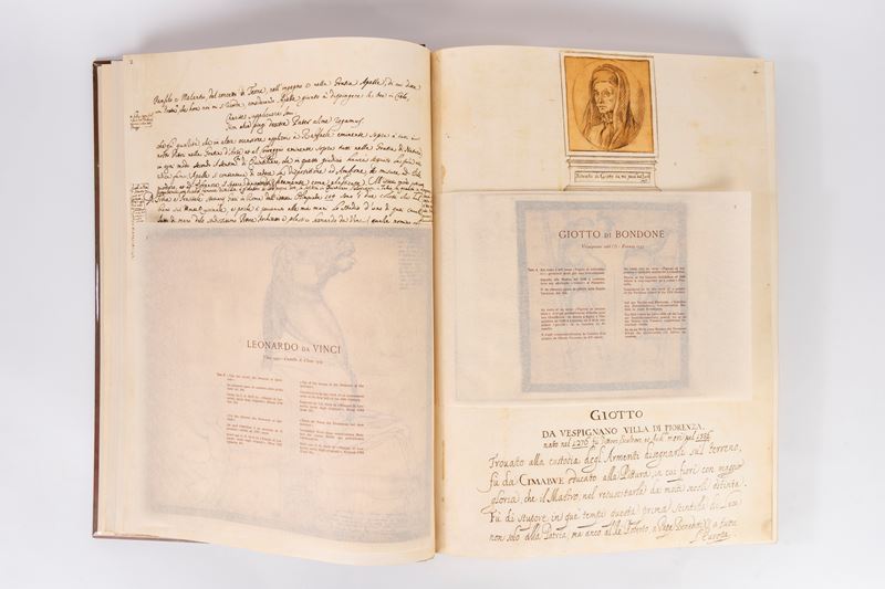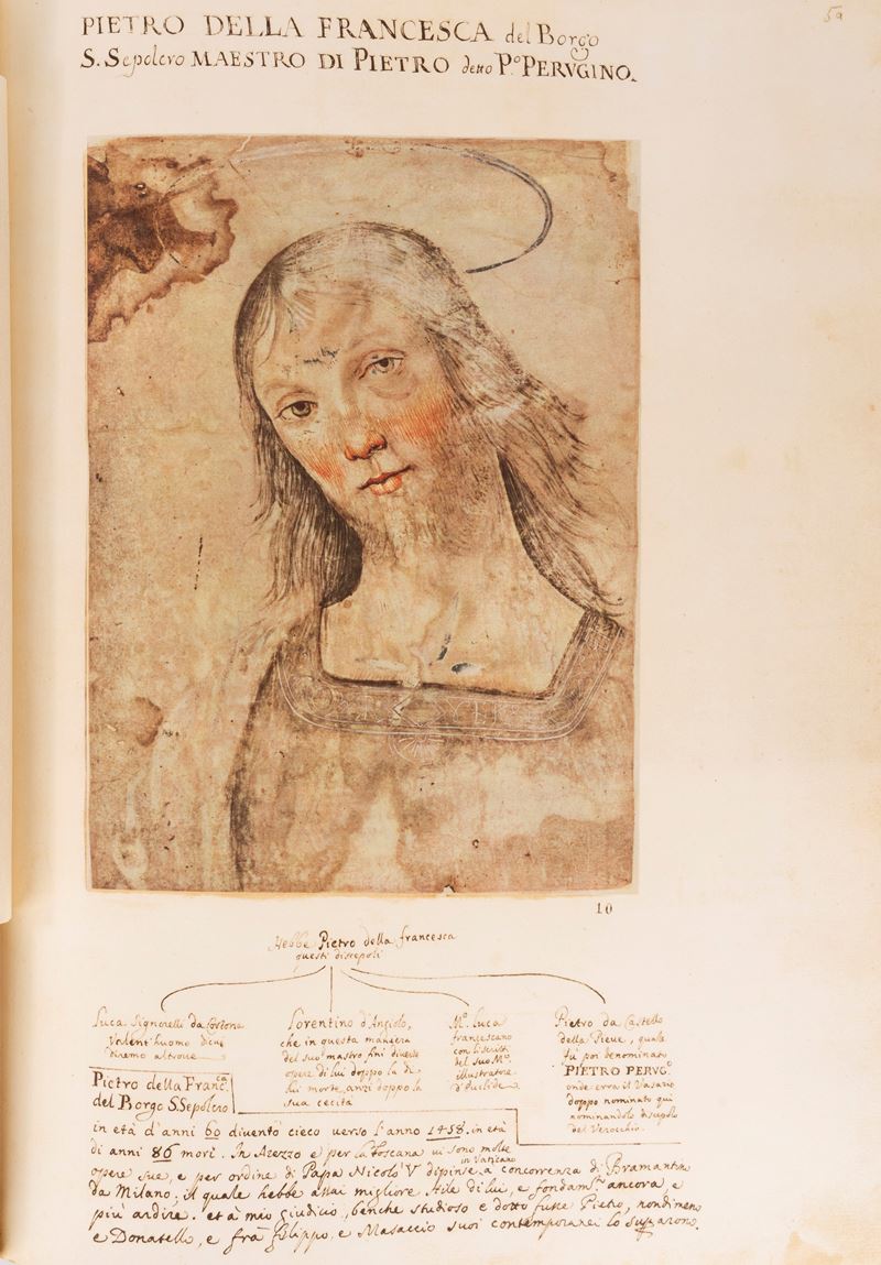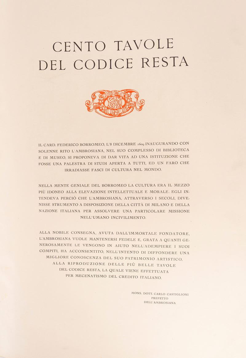 Milano, Off. Grafiche Pizzi per Credito Italiano, 1955. In 2° grande, 520x360 mm., pp. (12 di introduzione), ff. 104 illustrate con riproduzioni delle tavole a colori, protette da velina con scheda tecnico-artistica ad ogni singola tavola. Introduzione e didascalie in italiano, francese, inglese e tedesco. Legatura editoriale in mezzo cuoio con dorso a nervi, e piatti in cartone decorato che riproducono la legatura alle armi del Codice originale (lievi spellature). Selezione di 100 disegni del Codice Resta conservato integro all'Ambrosiana, formato a fine seicento dal Padre Sebastiano Resta e acquisito dalla biblioteca milanese nel 1706, famosa raccolta di 280 disegni di Maestri italiani antichi. Riproduzione in facsimile di misure e di colori, di grande qualità e di perfetto risultato.