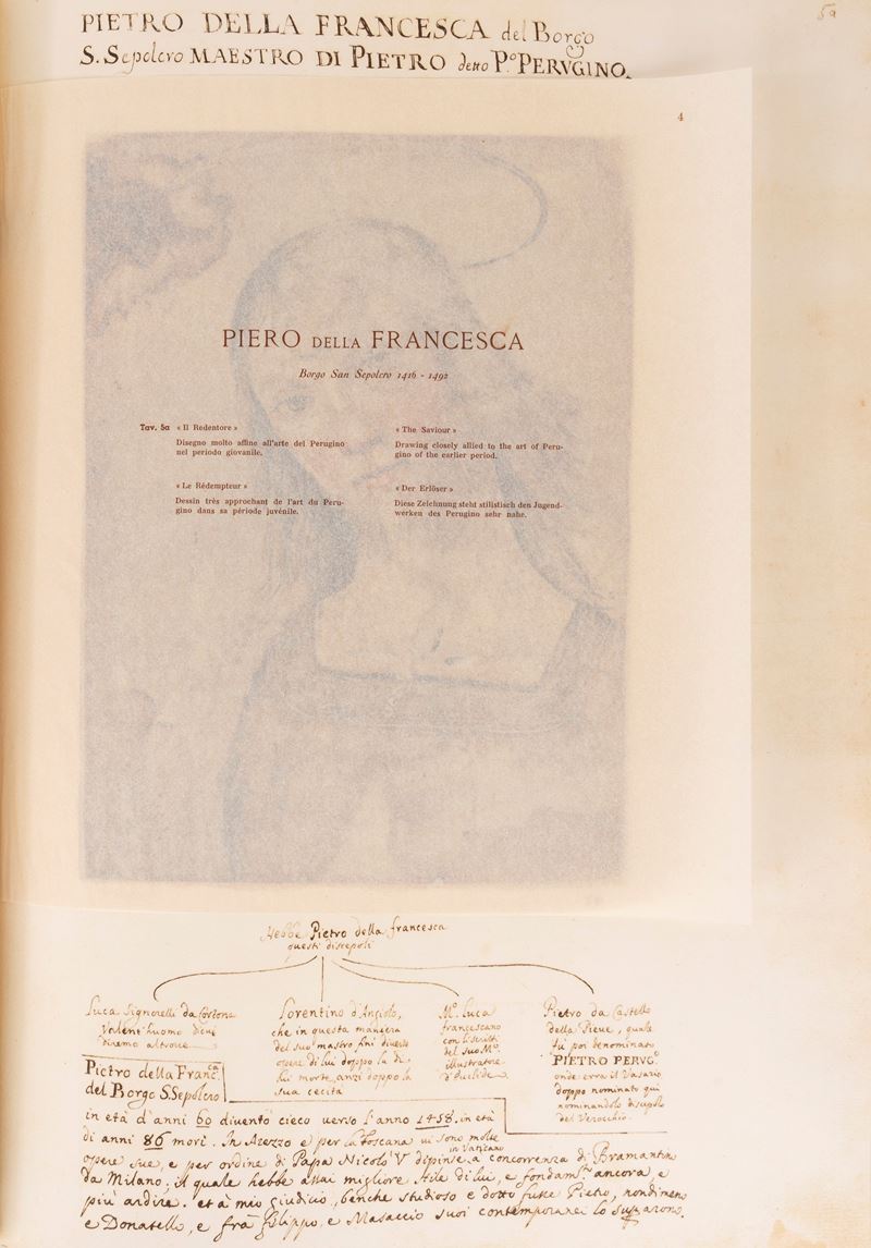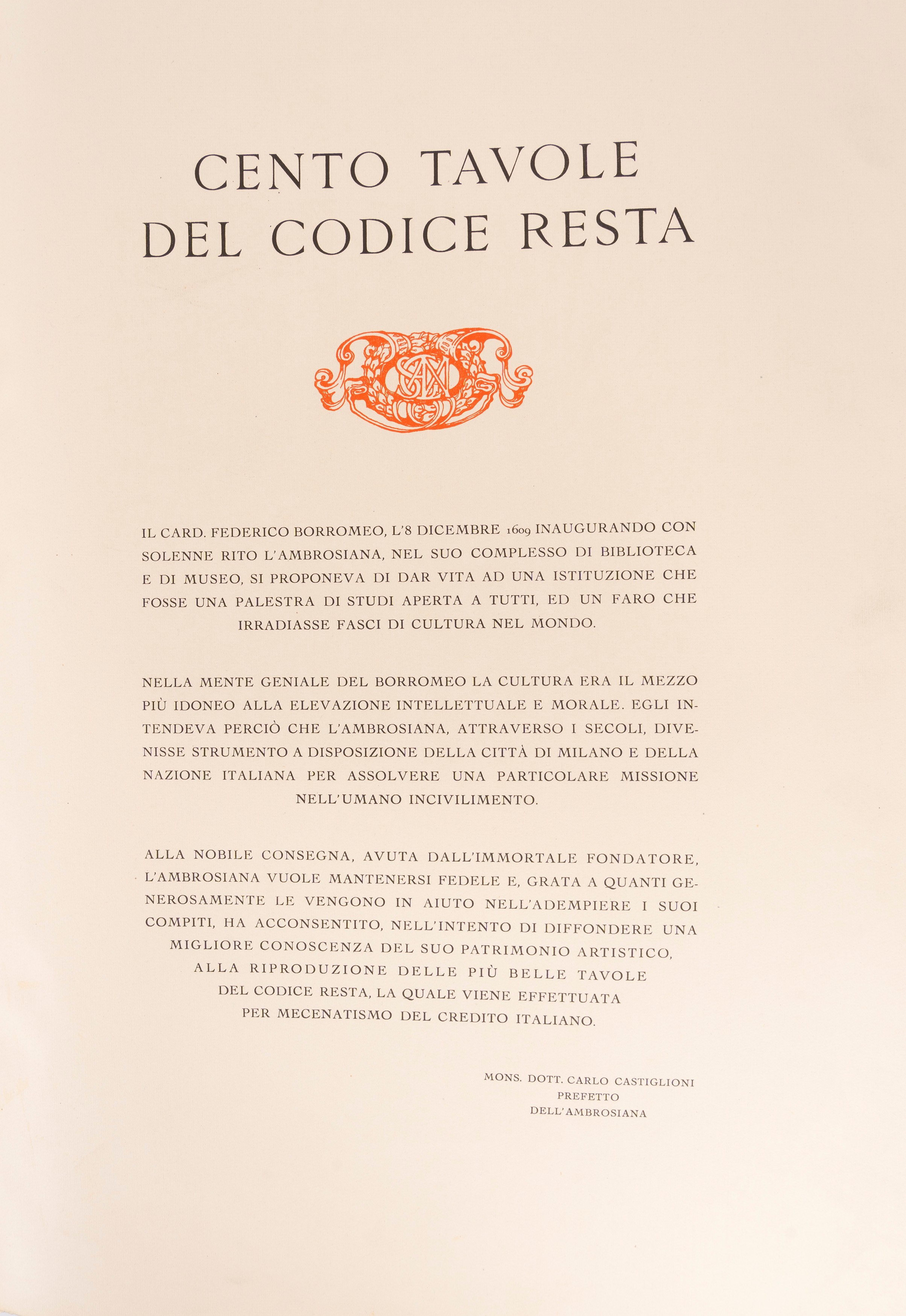 Sontuosa e stupenda edizione d'arte impressa in 2030 esemplari numerati, questo il numero 704, in cui sono riprodotti i disegni di Leonardo da Vinci, Andrea Mantegna, Giovanni Bellini, Botticelli, Piero della Francesca, Correggio, Tintoretto, Nicolas Poussin etc. Il Codice Resta è una raccolta di disegni che per tipologia, qualità e quantità dei soggetti non aveva precedenti e non avrebbe avuto eguali: disegni originali, bozzetti, studi, miniature dei più grandi artisti che avevano caratterizzato le età precedenti e che soprattutto segnavano il XVII secolo. Resta battezzò questa straordinaria antologia “Galleria portatile”, un vero museo itinerante che ripercorre la storia dell'arte italiana da Giotto fino ai suoi giorni, con disegni dei “capi delle quattro scuole Fiorentina antica, Romana antica e moderna, Lombarda antica, Veneziana antica e moderna”. Splendido esemplare.