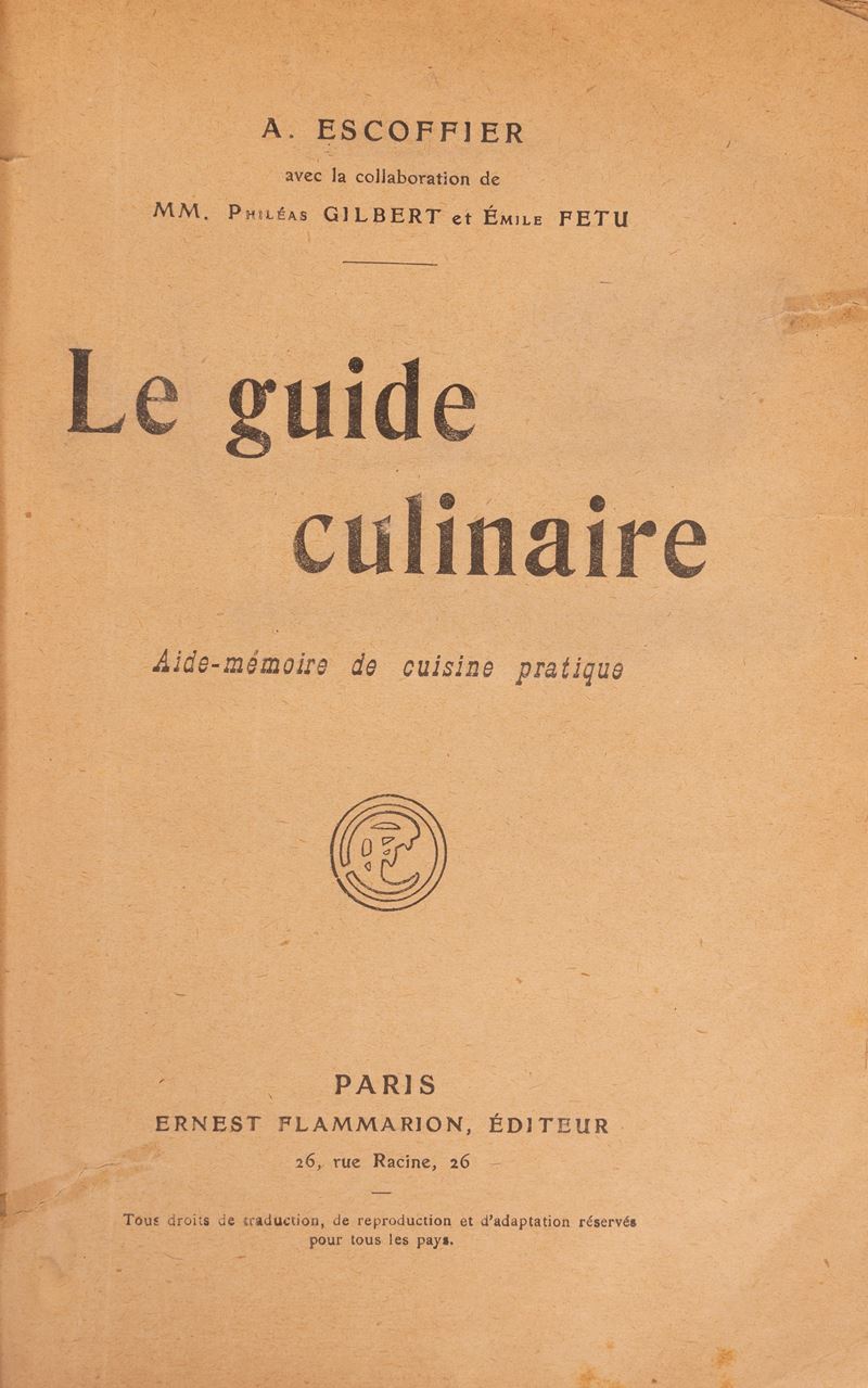 Importante libro di ricette di Georges Auguste Escoffier (Villeneuve-Loubet, 28 ottobre 1846 Monte Carlo, 12 febbraio 1935), cuoco francese autore anche di vari libri di gastronomia; soprannominato "cuoco dei re, re dei cuochi", fu decorato della Legion d'Onore nel 1920.