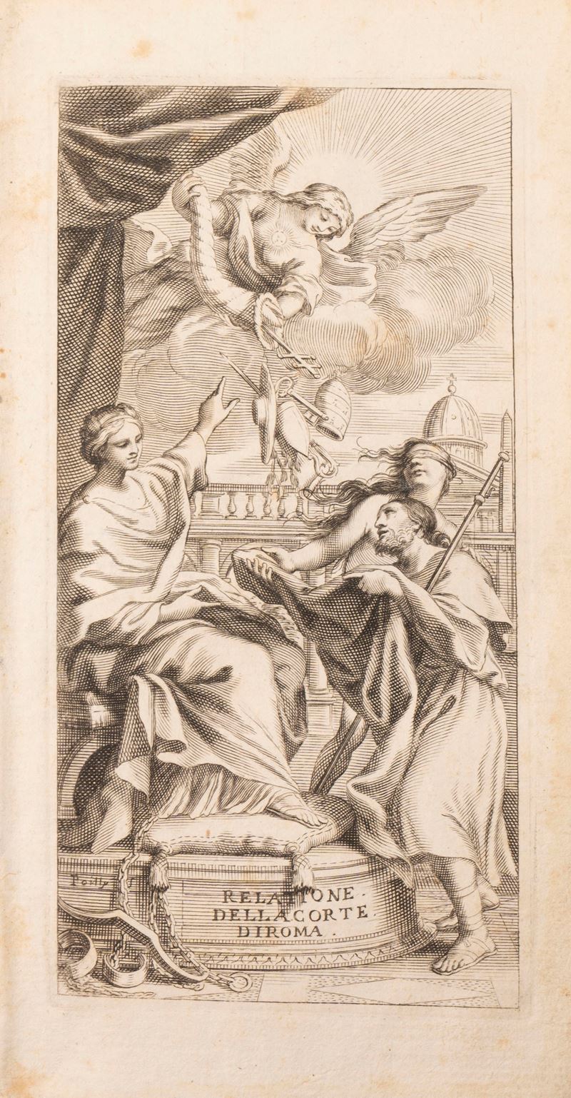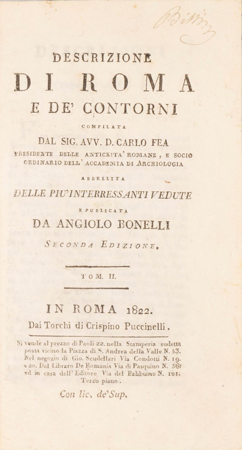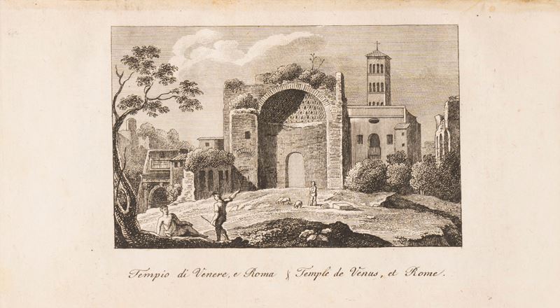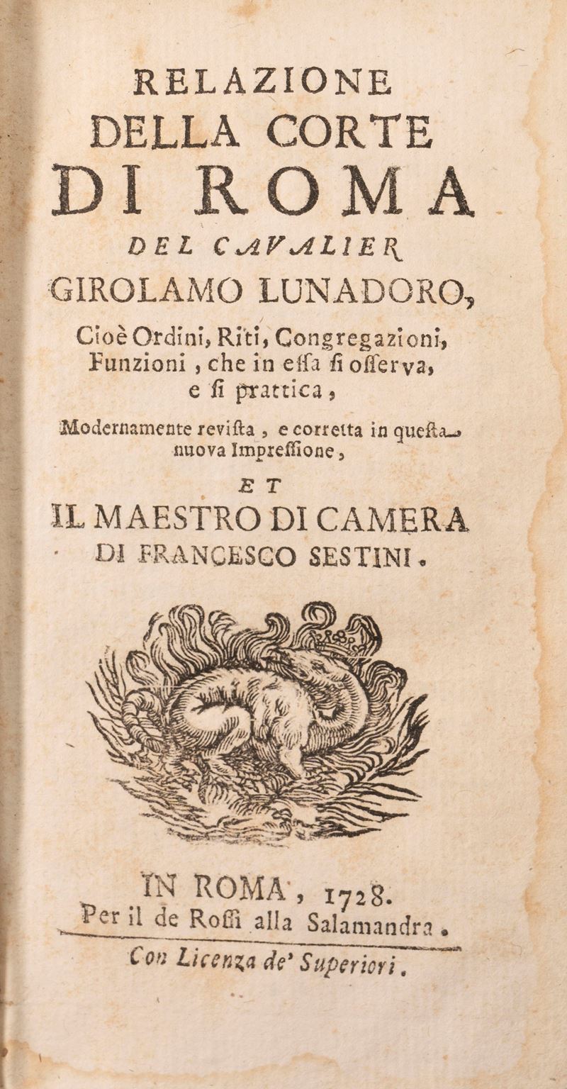 Tomi I e II di diverse edizioni: Tomo I (Roma, Crispino Puccinelli, 1824 - quarta edizione) e Tomo II (Roma, Crispino Puccinelli, 1822 - seconda edizione). In 16°.  Con numerose tavole incise in rame nel testo, alcune note manoscritte, qualche lieve fioritura, legature uguali in piena pergamena rigida, titoli in oro entro tasselli, tagli blu. Firma di appartenenza alla carta di guardia del tomo I. § Lunadoro, Girolamo, Relazione della corte di Roma, Roma, de Rossi alla Salamandra, 1728. In 12°. Antiporta incisa in rame, qualche lieve fioritura, legatura coeva in piena pergamena rigida, titolo manoscritto al dorso, qualche piccola macchia e lievi difetti.