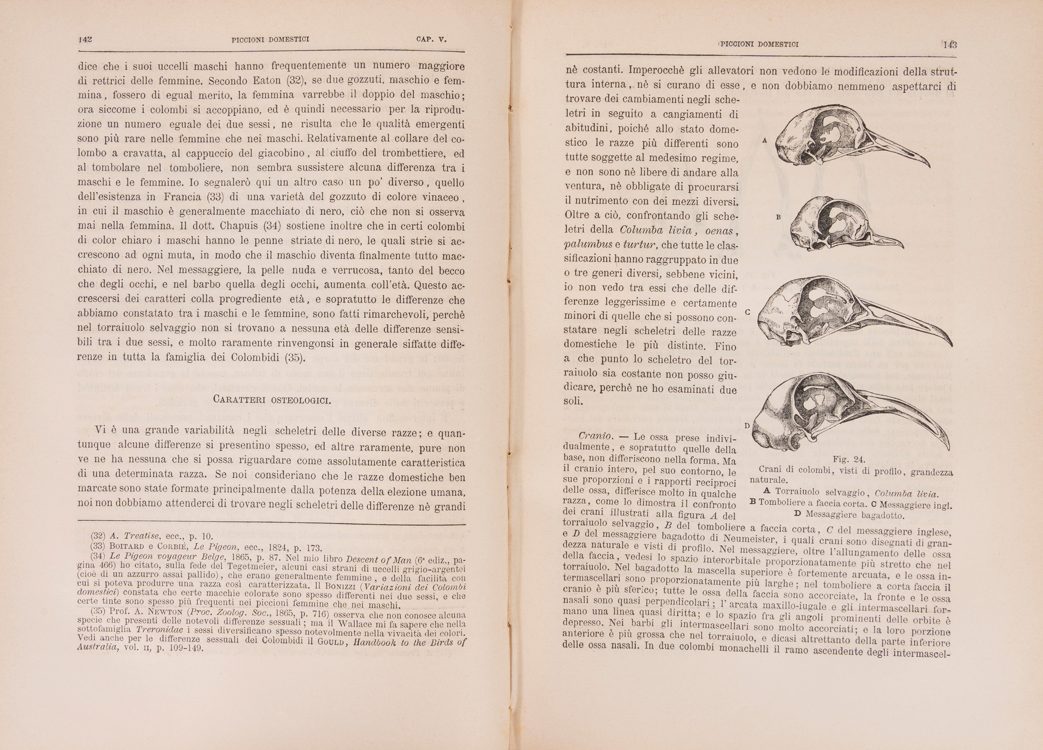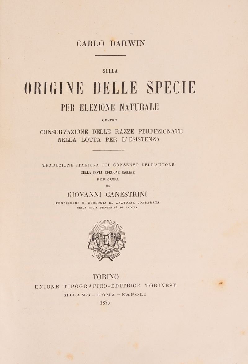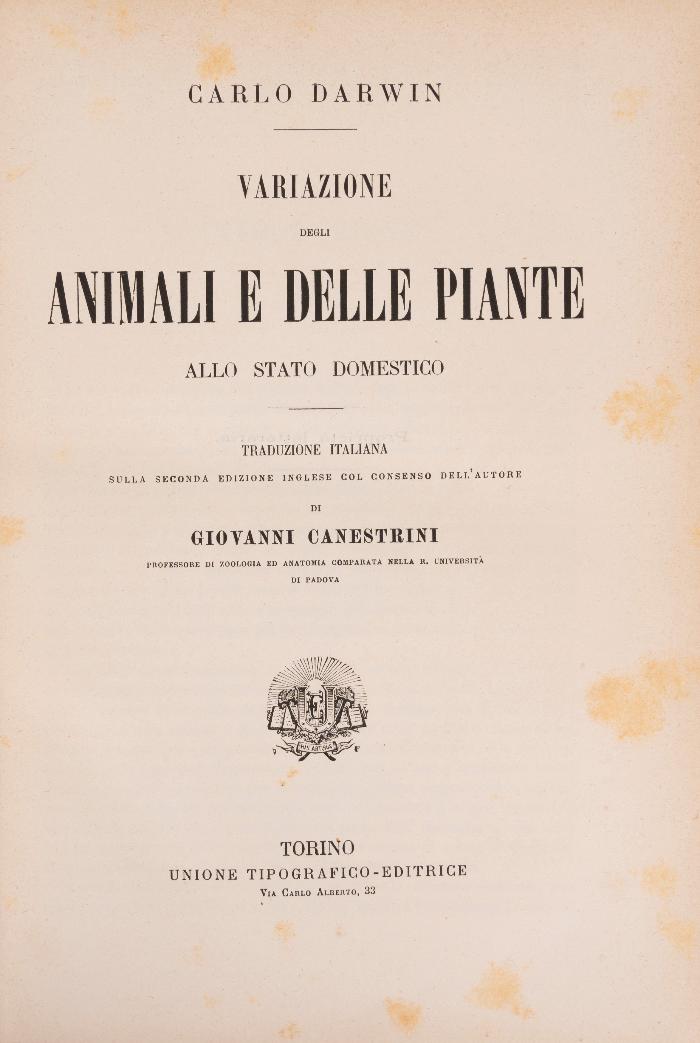 Torino, Unione Tipografico - Editrice Torinese, 1875. In 8°. Legatura coeva in tela rossa, decorazione in oro ai piatti e al dorso, alcuni difetti e segni del tempo. § Darwin, Charles, Variazione degli animali e delle piante allo stato domestico. Torino, Unione Tipografico - Editrice Torinese, s.d.. In 8°. Diverse illustrazioni in bianco e nero nel testo, qualche rara fioritura, stessa legatura del precedente.