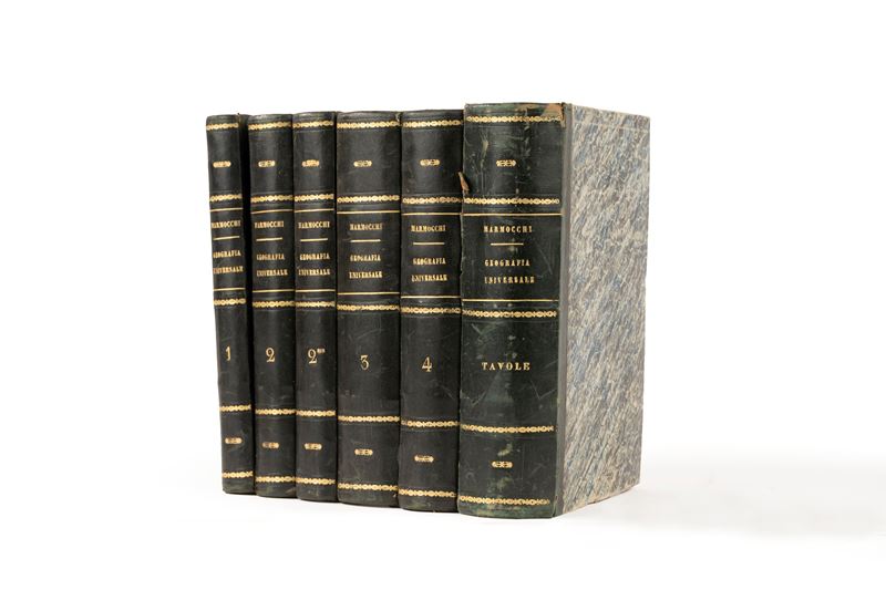 Torino, Società Editrice Italiana, 1856. 6 voll. In 8°. 5 tomi di testo e 1 dedicato interamente alle tavole. Con 48 tavole incise in rame e ripiegate più volte, qualche lieve difetto. Legature coeve in mezza pelle verde, titoli e fregi in oro al dorso, lievi difetti.