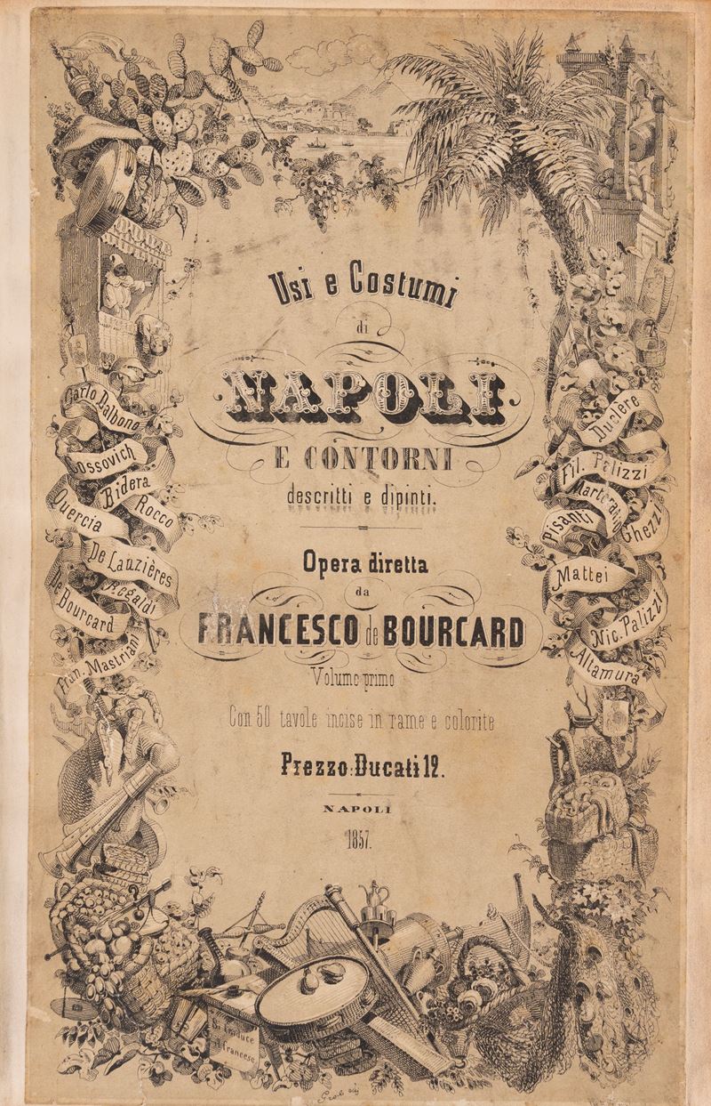 Napoli, Nobile, 1853-1858. In 4°. 2 voll. Con 100 tavole litografiche a colori protette da velina su disegni di Filippo Palizzi (1818-1899), Theodore Duclere (1812-1869) e Carlo Martorana (1826-1849), alcune brunite, lievi fioriture sparse. Brossura editoriale entro legatura in mezza pelle verde con angoli e piatti cartonati, titolo in oro impresso al dorso.