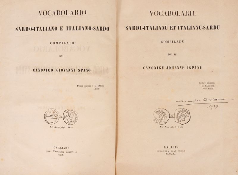 Cagliari, Tipografia Nazionale, 1851-52. 2 voll. Doppio frontespizio in italiano e sardo con piccola vignetta, leggera brunitura, brossura editoriale conservata entro legatura contemporanea in mezza tela blu, titolo entro tassello cartaceo al dorso. Firma di appartenenza di Romualdo Ardissone datata 1937.