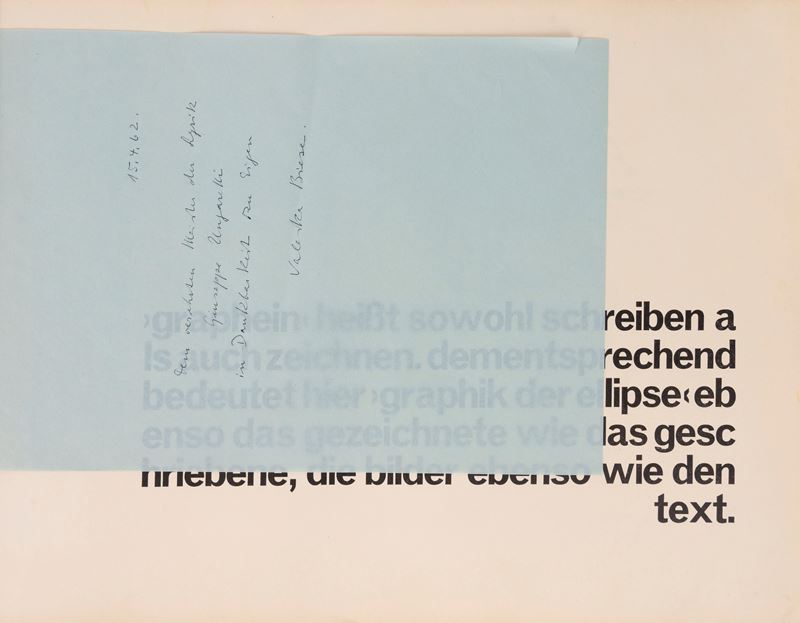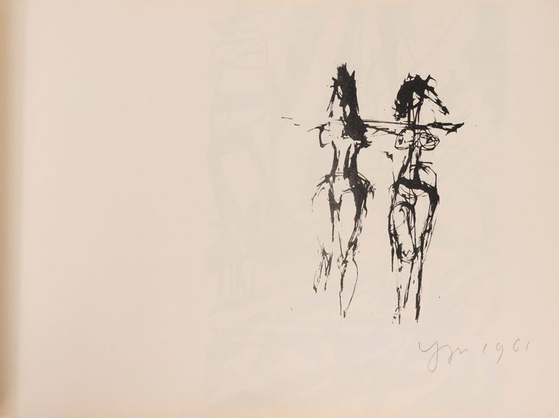Catalogo di mostra in formato oblungo senza dati tipografici [1961], con 7 tavole a colori firmate dagli artisti, testo in tedesco, brossura in cartoncino viola. Dedica della curatrice a Giuseppe Ungaretti.