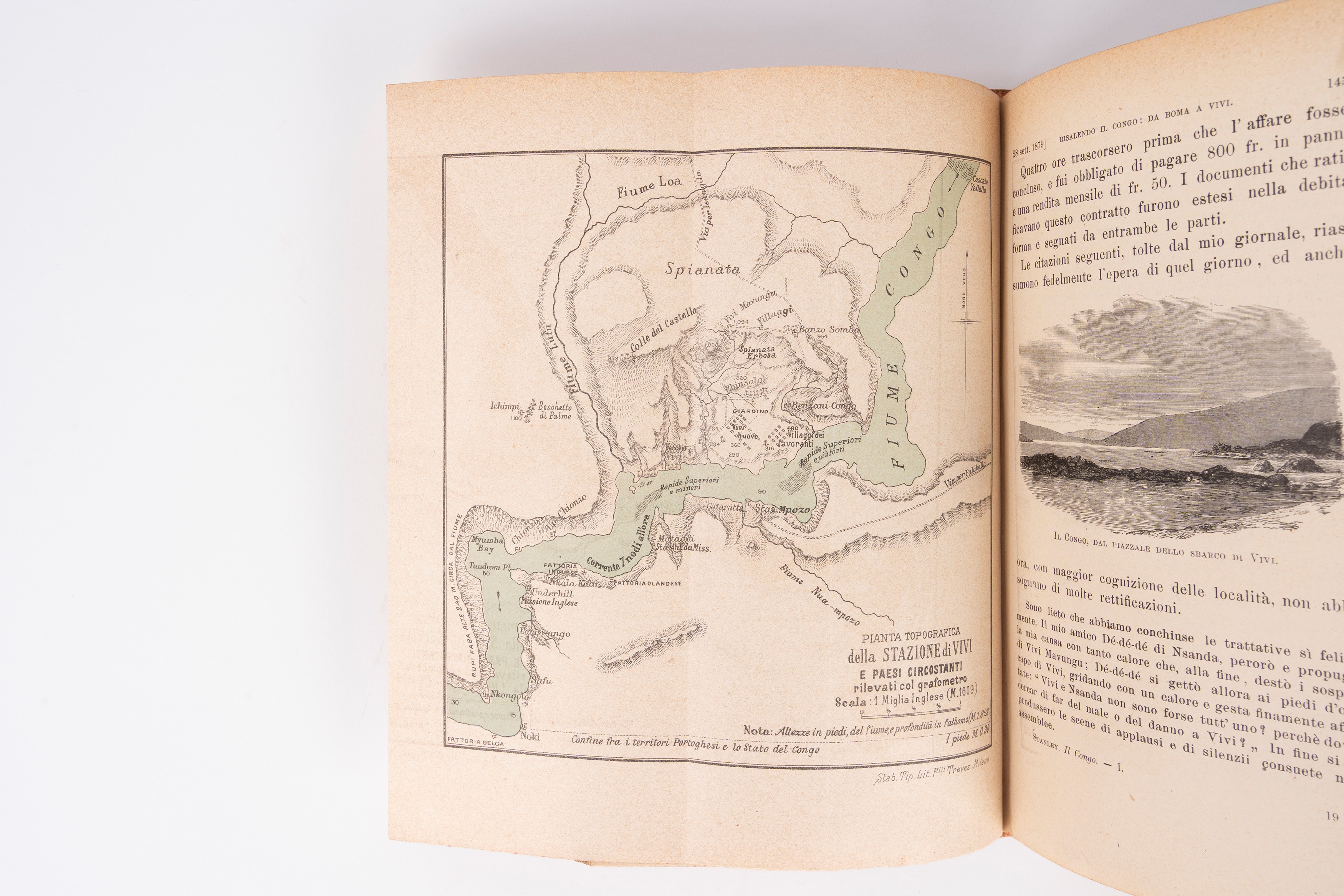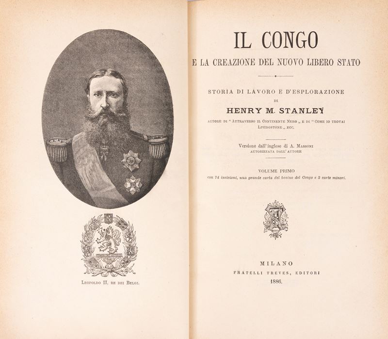 Milano, Fratelli Treves, Editori, 1886. Due voll. Incisione in antiporta del re dei Belgi Leopoldo II, edizione corredata da incisioni in bianco e nero nel testo a piena pagina, due carte pieghevoli (96 x 58 cm) a fine volume I e II del bacino del Congo. Legatura in mezza pelle rossa con titolo in oro impresso al dorso a quattro nervi, lievi difetti del tempo.
