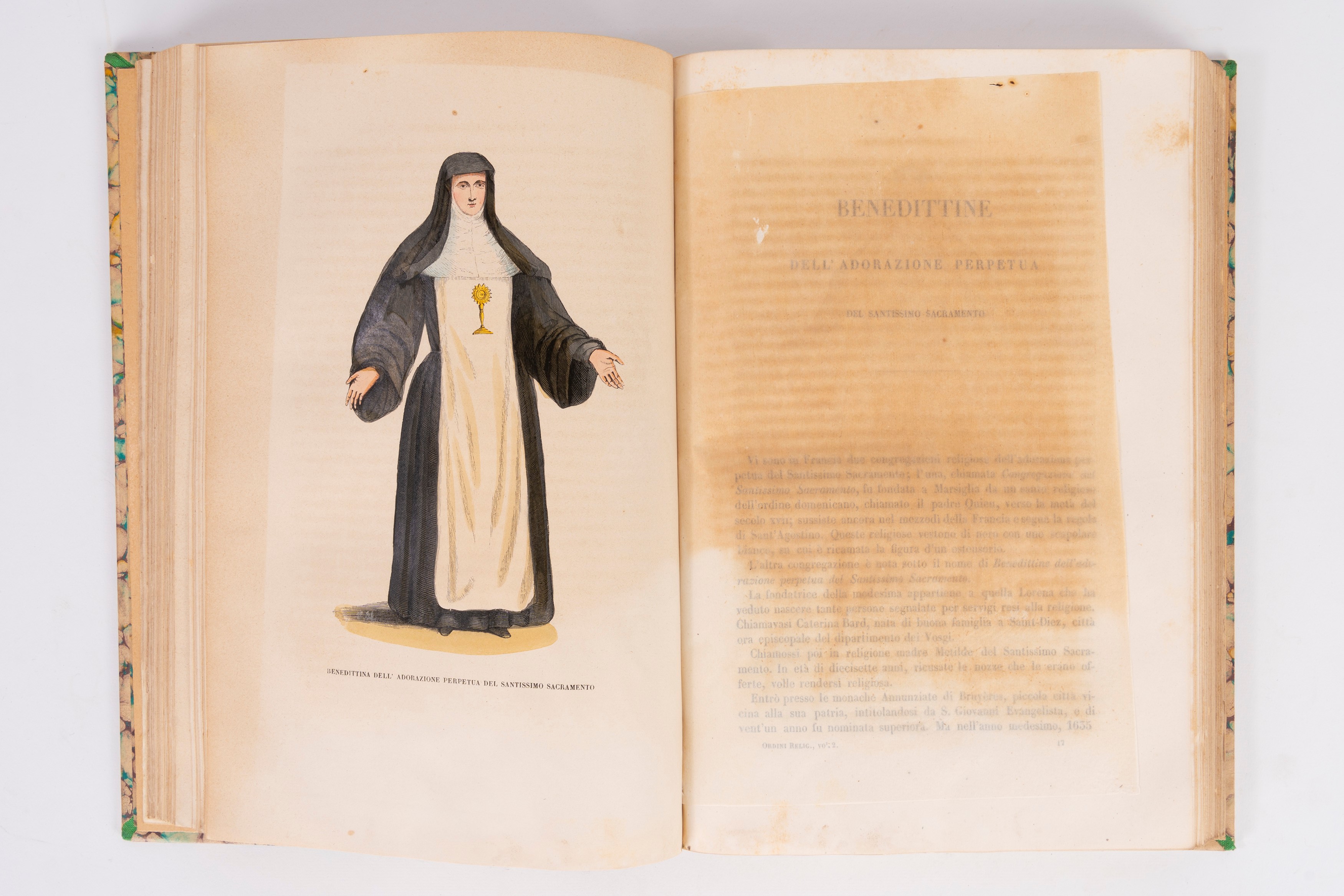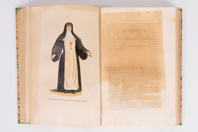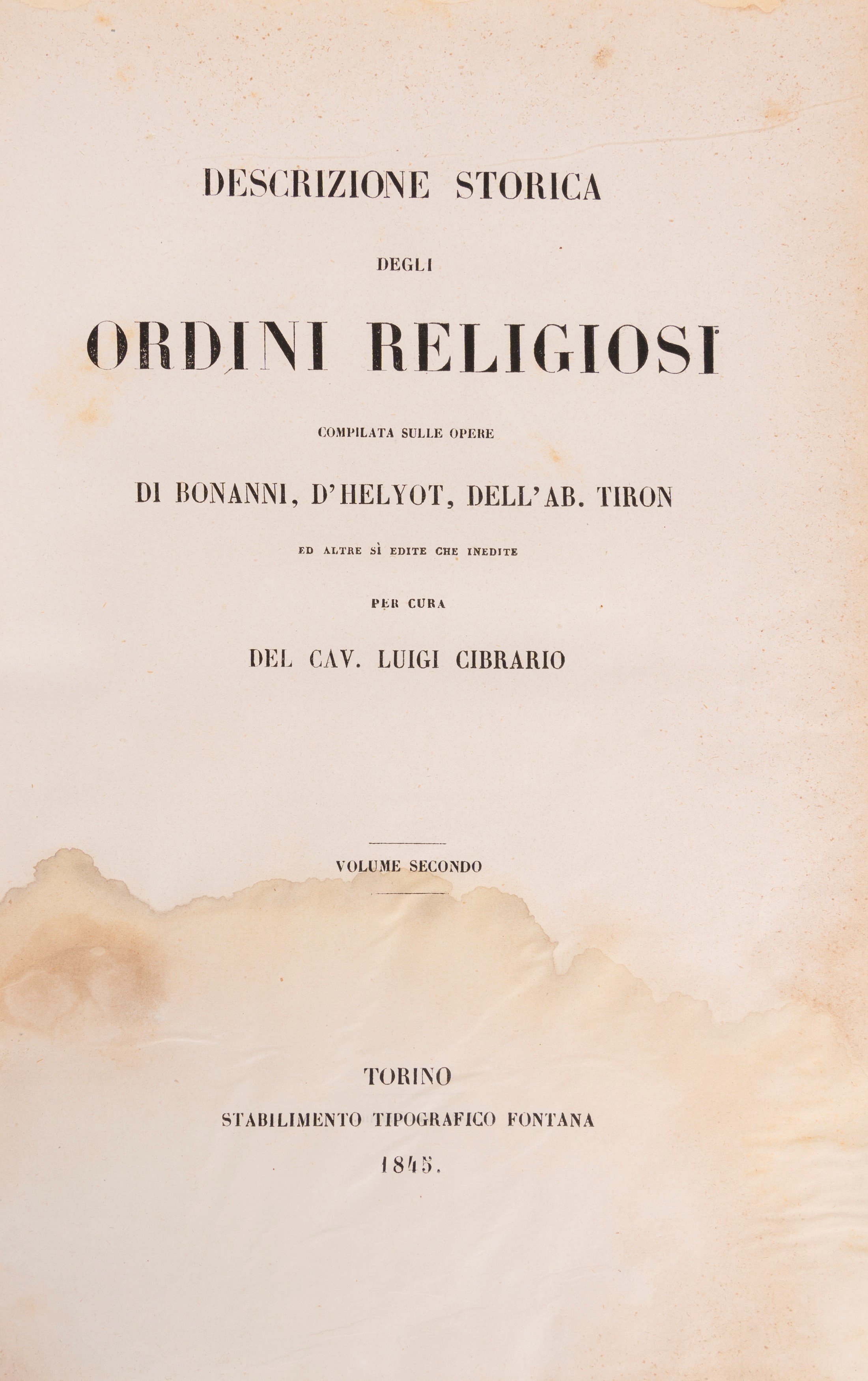 Torino, stabilimento tipografico Fontana, 1845. In 8°. 2 voll. Con 94 tavole a colori e protette da velina, tracce di umidità alle prime carte e leggere fioriture sparse. Legatura in mezza pelle, piatti marmorizzati in cartone e titolo impresso in oro entro tassello rosso al dorso liscio.