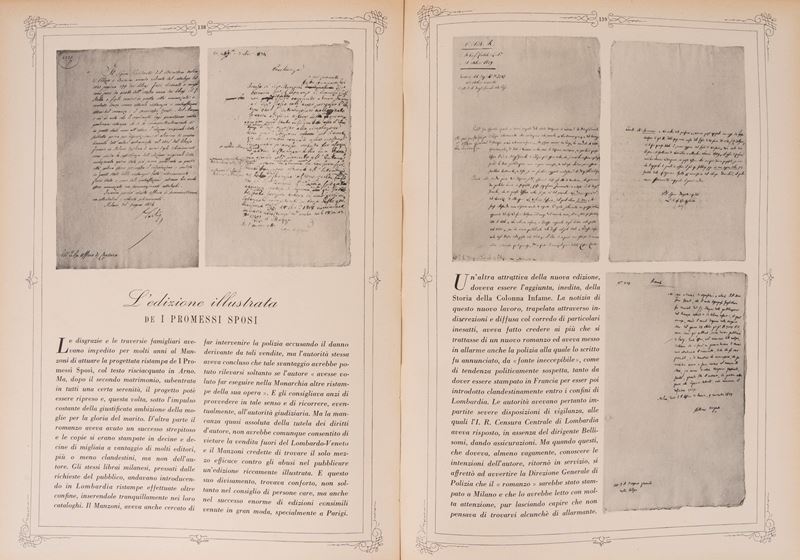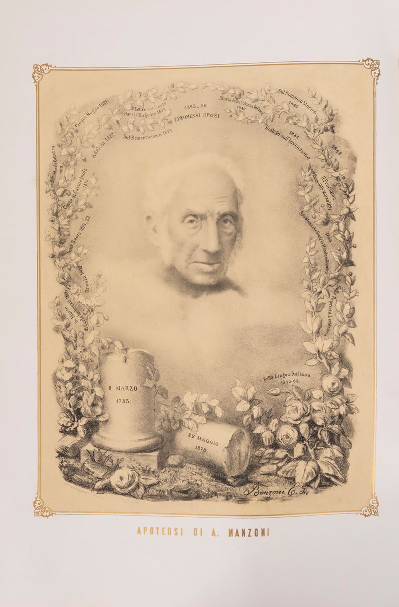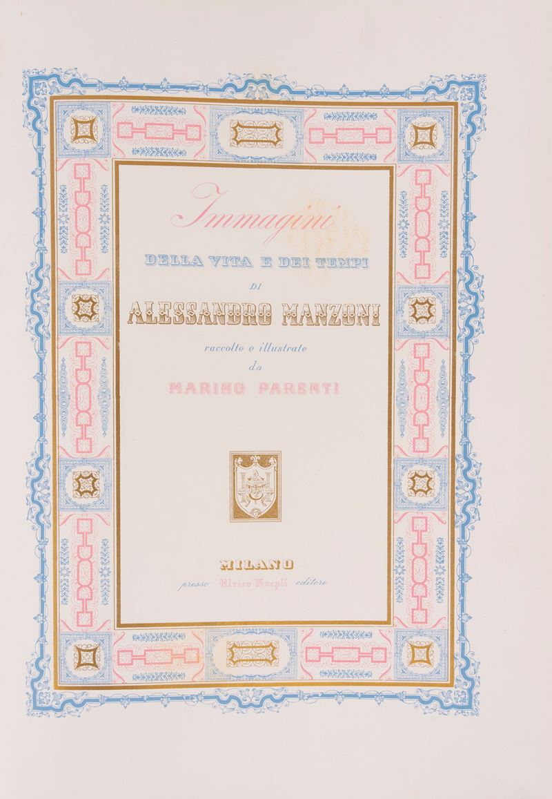 Milano, Ulrico Hoepli, [1942]. In 4°. In antiporta 1 tavola litografiche di Benzoni che descrive "L'apoteosi di A. Manzoni", numerose illustrazioni e fregi cromolitografici nel testo, elegante legatura editoriale in cartonato riccamente illustrato a colori con titolo in nero al dorso, lievissimi segni del tempo.