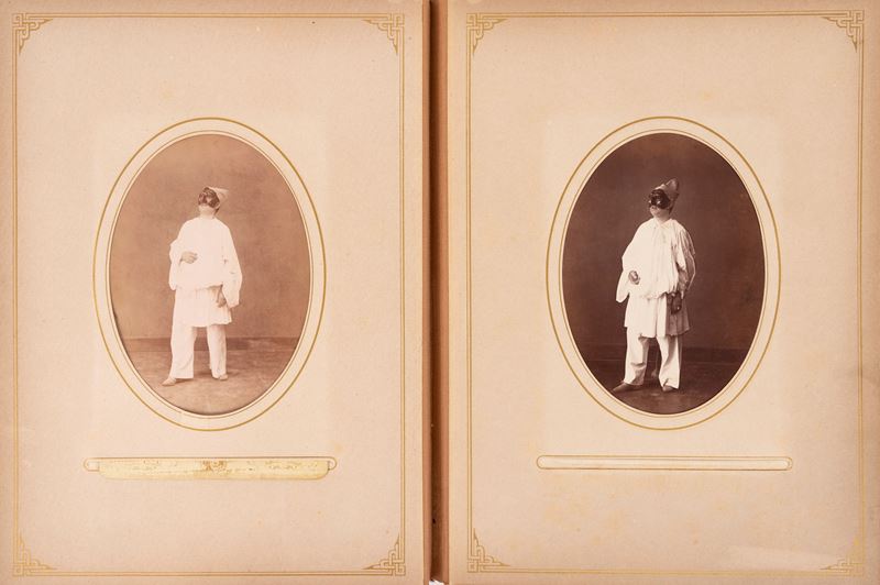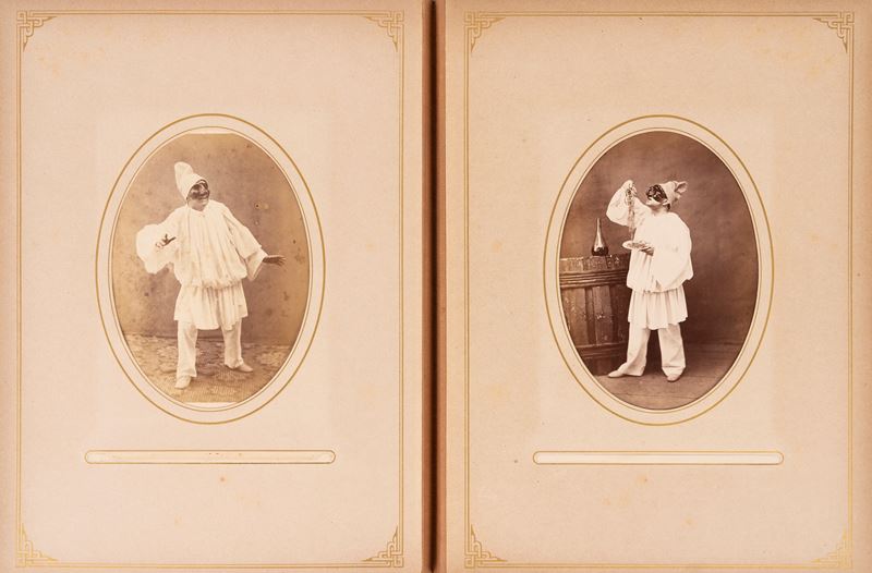 Splendido e ricco album di fotografie realizzate da Giorgio Sommer, 42 fotografie in massima parte raffiguranti Pulcinella in varie pose, cui seguono foto di attori napoletani tra cui De Angelis, Milzi, Scarpetta, Novelli, Segré, De Muto, Grasso etc. in molti casi con dedica a Ettore Petrolini, il cui ex libris si trova al contropiatto. Preziosa testimonianza dei rapporti stretti e amicali tra Petrolini e il teatro partenopeo. Misure esterne dell'album: 295 x 225 mm., all'interno sono presenti dei cartoncini forati con finestre dove inserire le foto di misura 172 x 110 circa.