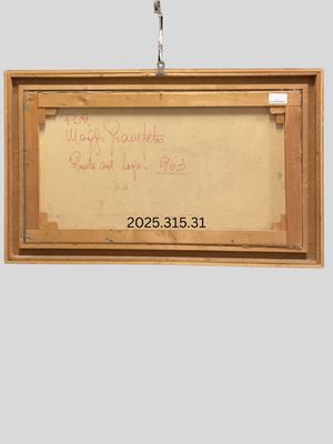a retro firmato, titolato e datato: Pitt. Maggi Giampietro Quiete sul lago 1963