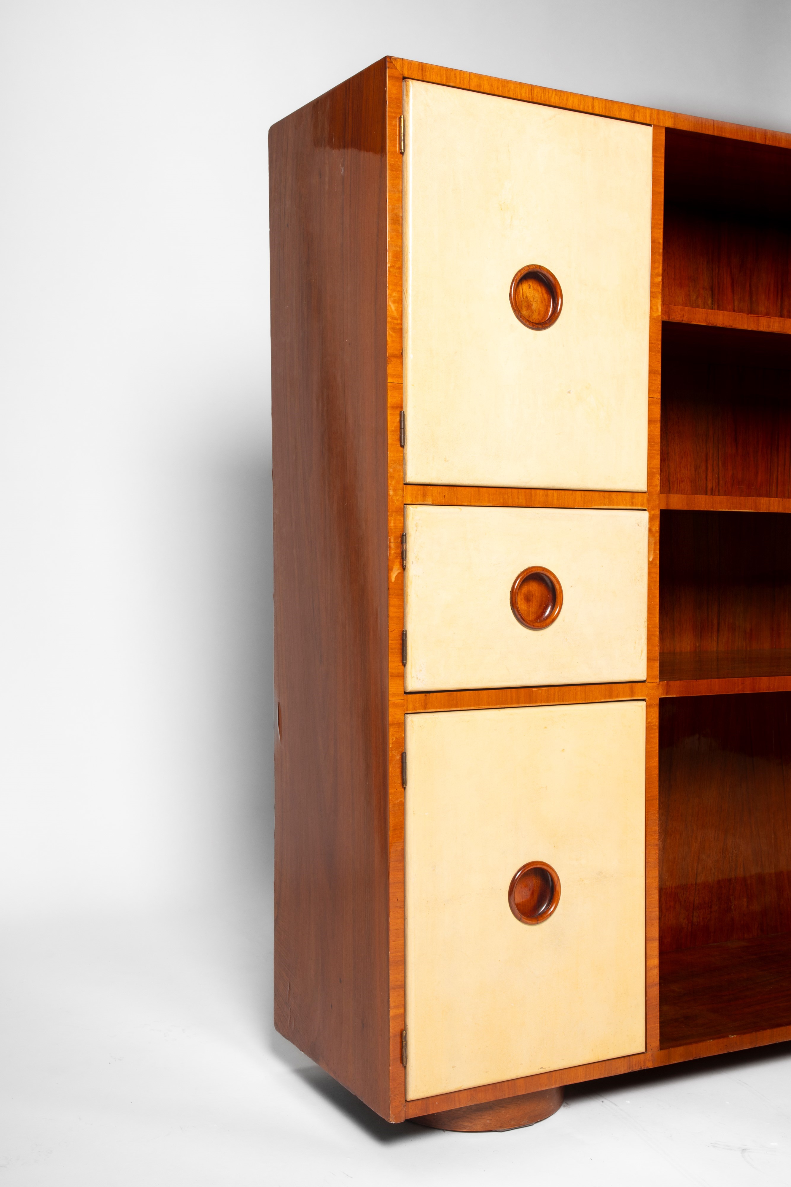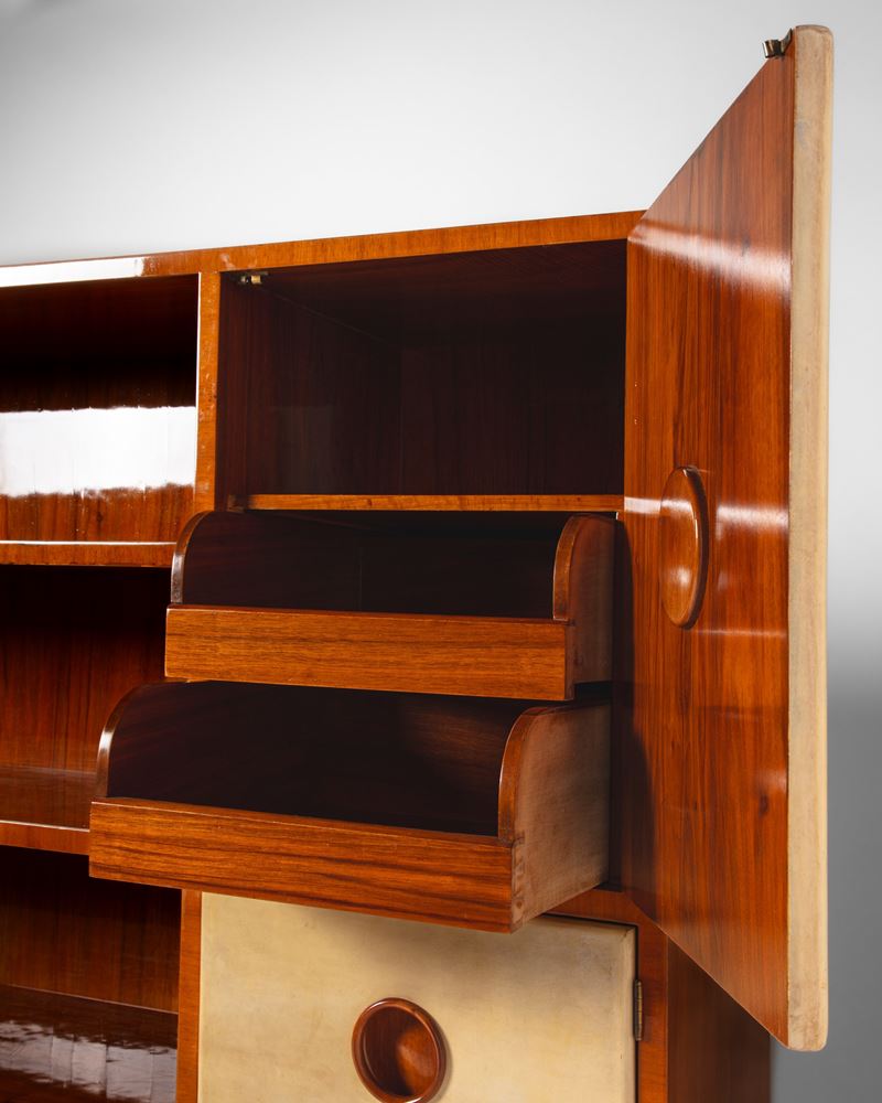 Mobile da sala con sostegni a cilindro piatto, impiallacciatura in piuma di noce, ante rivestite in pergamena e cassetti interni