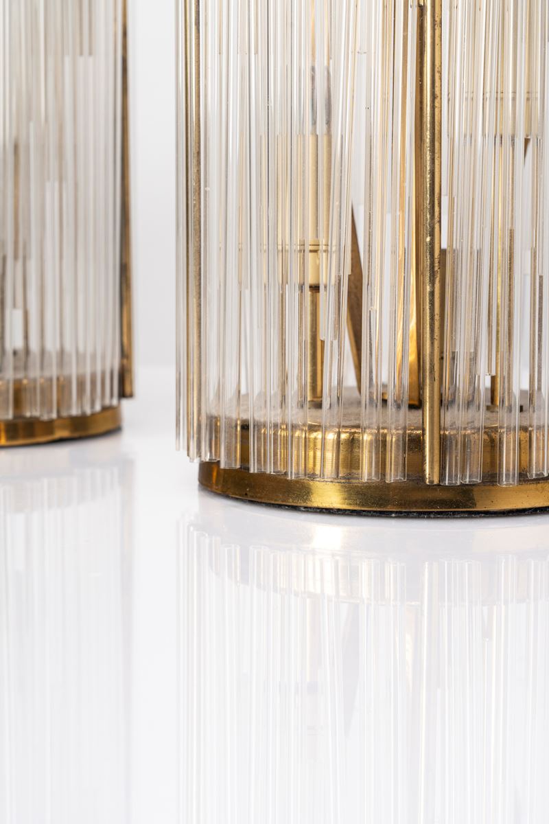Coppia di lampade da tavolo con struttura in ottone e diffusori a canne in vetro soffiato