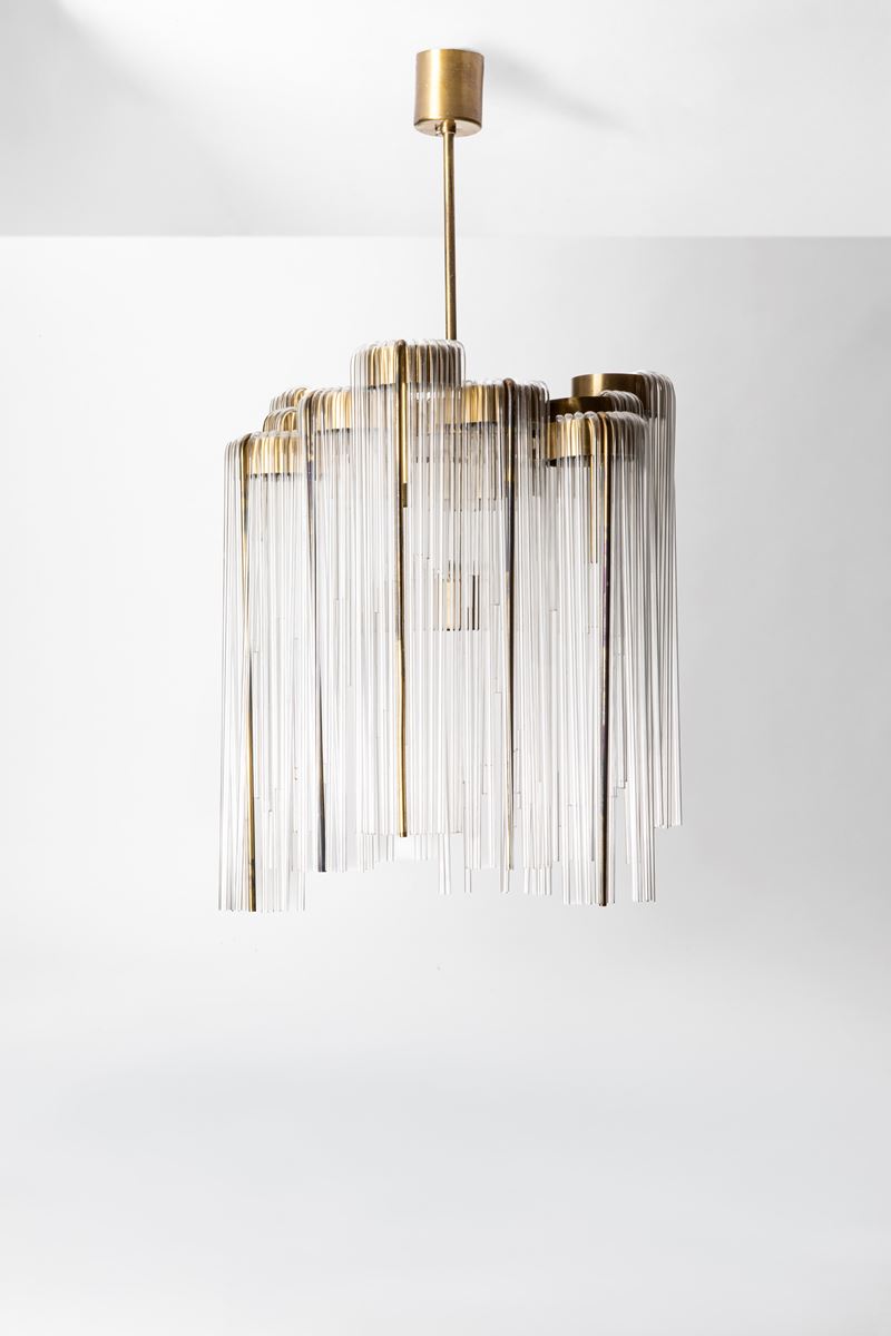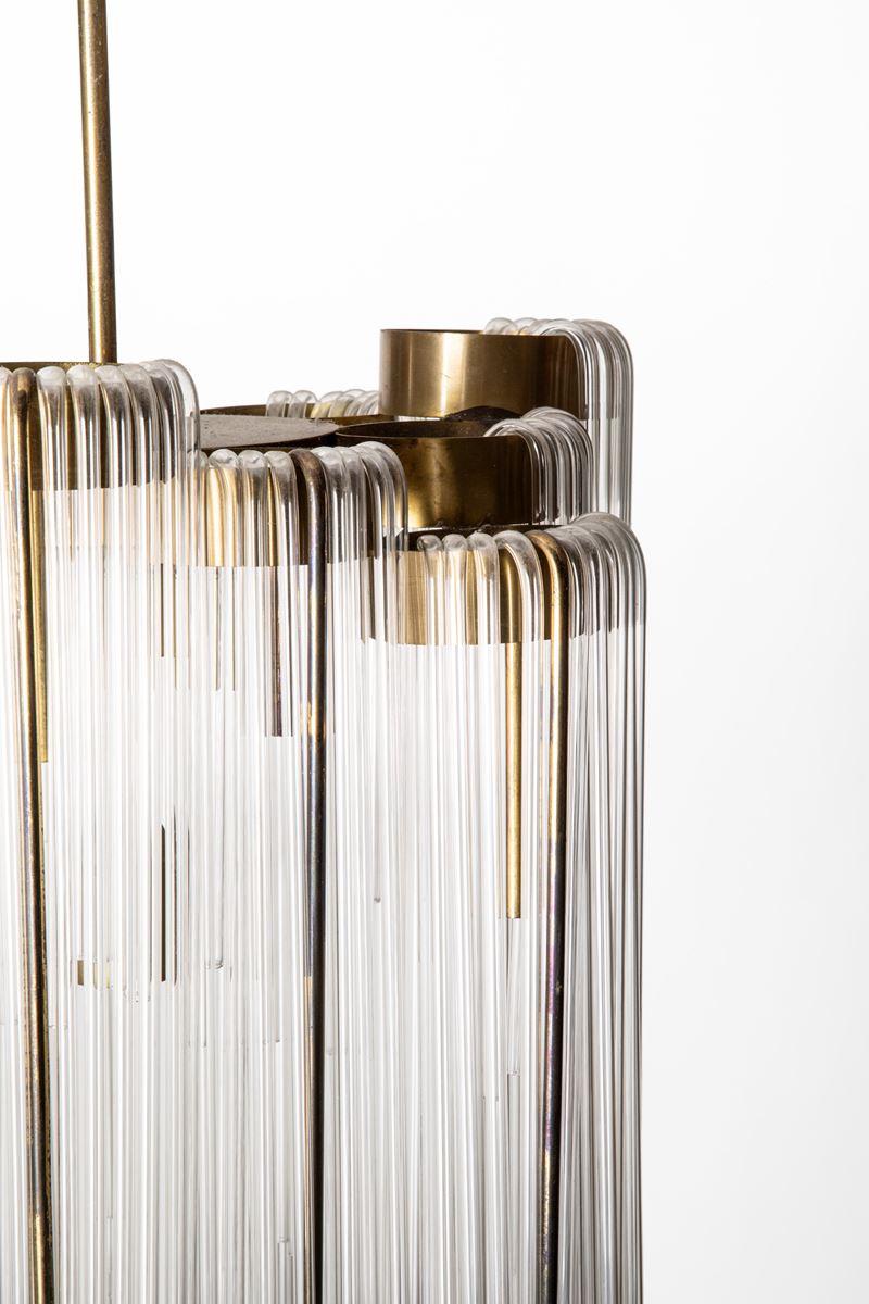 Lampadario con struttura in ottone e diffusori a canne in vetro soffiato